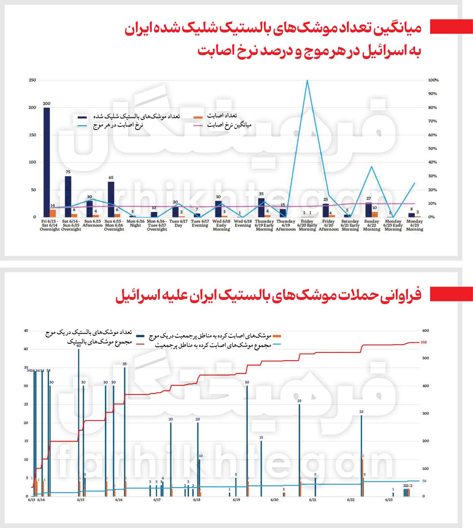 ایران در روز نخست تیرماه، ۴۸۰ درصد بیشتر از روز قبل از آن موشک پرتاب کرد. در 31 خرداد، 5 موشک به سمت اسرائیل شلیک شده بود که این رقم روز بعد به 29 موشک رسید. در روز دوشنبه دوم تیر این رقم مجدداً 68 درصد کاهش داشت و به 9 فروند رسید. به ادعای این مؤسسه آمریکایی، بازدهی 37 درصدی موشکهای عبورکرده از چندین لایه پدافندی اسرائیل در یکم تیرماه و بازدهی 25 درصدی در دوم تیرماه، موفقترین حملات ایران از زمان آغاز درگیری بود. این مؤسسه ادعا کرده افزایش موفقیت ممکن است به دلیل تغییر رویکرد ایران به استفاده از موشکهای بالستیک پیشرفتهتر و کلاهکهای جداشونده باشد. این رویکرد نشان میدهد ایران موشکهای خود را که در طول موجهای مشخص شلیک کرده برای نفوذ بهتر به دفاع هوایی اسرائیل، تطبیق داده است. همچنین کاهش ظرفیت سامانههای پدافندی اسرائیل نیز که به ذخایر موشکی آمریکا وابستگی شدیدی دارد، در این عامل مؤثر بوده است.
