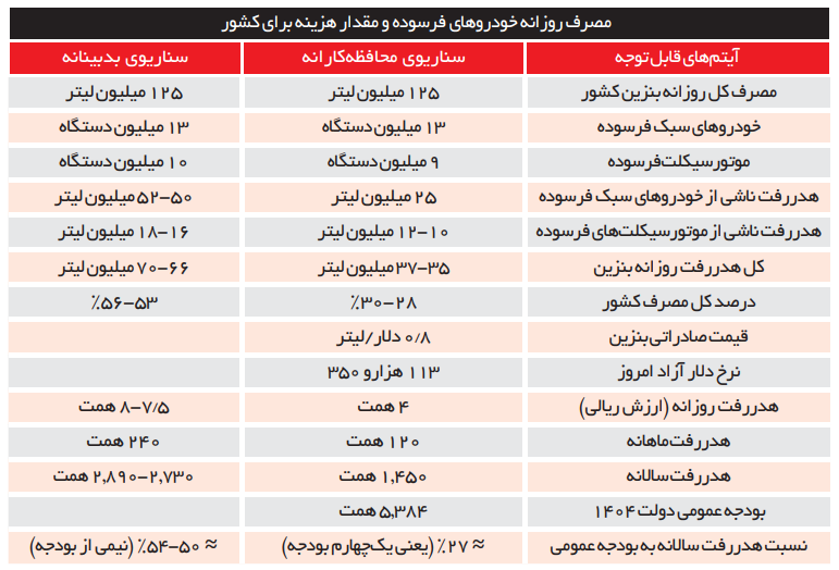 جدول ارائهشده گزارش نشان میدهد مصرف روزانه خودروهای فرسوده چقدر است و چه مقدار هزینه برای کشور در بر دارد. محاسبه در دو حالت بدبینانه و خوشبینانه و محافظهکارانه ارائه شده است. در ضمن محاسبات انجامشده با نرخ بنزین 80 سنت است. این بررسی در حالت خوشبینانه میگوید که ما به اندازه 27 درصد از بودجه کل کشور را صرف تأمین سوخت خودروهای فرسوده میکنیم (محاسبه خوشبینانه). حالت بدبینانه این محاسبه میگوید که سالی 52 درصد کل بودجه ایران صرف خودروهای فرسوده میشود. بودجه ایران امسال پنجهزارو ۳۰۰ همت بوده است. 27 درصد بودجه یعنی هزارو 450 همت. 54 درصد بودجه یعنی دوهزارو ۸۹۰ همت. این در حالی است که آزادسازی قیمت بنزین تا 200 یا 300 همت برای دولت آورده مالی دارد و این سؤال جدی را پیش میکشد که چرا رؤسای دولت مسئله فرسودگی ناوگان را اصلا مورد توجه قرار نمیدهند و مدام مسئله قیمت را فقط پیش میکشند؟ با خاطرات تلخ و دردناکی که جامعه از آبان 98 دارد؟