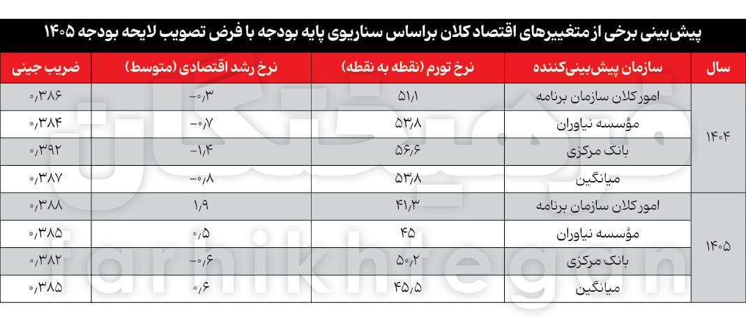 سازمان برنامه و بودجه در سند پشتیبان لایحه بودجه 1405 اقدام به برآورد و پیشبینی شاخصهای اقتصاد کلان کرده است. در این اسناد با توجه به شرایط اقتصاد کشور و لحاظ نمودن مؤلفههای تأثیرگذار بر اقتصاد و با فرض ادامه وضعیت موجود در روابط خارجی و تحریمهای اقتصادی، برآورد نهادهای مختلف ازجمله بانک مرکزی، مؤسسه نیاوران و امور اقتصاد کلان سازمان برنامه و بودجه برای متغیرهای نرخ تورم، نرخ رشد اقتصادی و ضریب جینی برای سال ۱۴۰۴ و سال ۱۴۰۵ با فرض تصویب لایحه بودجه پیشنهادی ارائه شده است. طبق اسناد پشتیبان بودجه، میانگین برآورد سه نهاد برای نرخ تورم نقطه به نقطه در سال ۱۴۰۴ برابر 53.8 درصد و سال ۱۴۰۵ برابر 45.5 درصد است که حاکی از پیشبینی کاهش 8.3 واحد درصدی نرخ تورم در سال ۱۴۰۵ نسبت به سال ۱۴۰۴ است. میانگین برآورد سه نهاد برای متوسط نرخ رشد اقتصادی در سال ۱۴۰۴ برابر منفی 0.8 درصد و سال ۱۴۰۵ برابر 0.6 درصد است که حاکی از پیشبینی افزایش 1.4 واحد درصدی نرخ رشد اقتصادی در سال ۱۴۰۵ نسبت به سال ۱۴۰۴ است. میانگین برآورد سه نهاد برای ضریب جینی در سال ۱۴۰۴ برابر 0.387 واحد و سال ۱۴۰۵ برابر 0.385 واحد است که حاکی از پیشبینی کاهش 0.002 واحدی ضریب جینی در سال ۱۴۰۵ نسبت به سال ۱۴۰۴ است که بیانگر پیشبینی بهبود محدود ضریب جینی است.