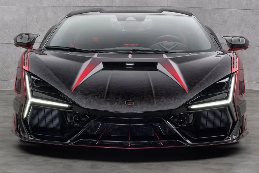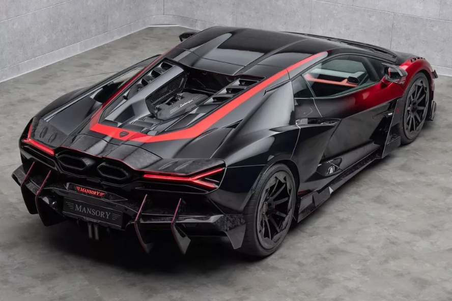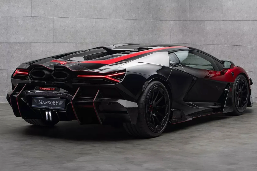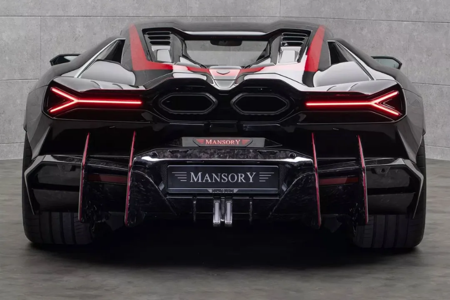 منصوری برای این پروژه سنگ تمام گذاشته و تقریباً تمام پنلهای اصلی بدنه روئلتو را با قطعاتی از جنس فیبر کربن فورجکاریشده جایگزین کرده است. این تغییرات گسترده از کاپوت جدید با ورودیهای هوای بزرگ و سپر و اسپویلر جلوی کاملاً سفارشی شروع میشود و تا جایجای بدنه ادامه پیدا میکند. ظاهر خودرو ترکیبی جسورانه از فیبر کربن خالص، رنگ مشکی براق و جزئیات قرمز روشنی است که روی گلگیرهای جلو، بخشهایی از درها و نوارهای اطراف پوشش موتور به چشم میخورد. ورودیهای هوای جانبی و رکابهای جدید نیز به ابهت این هیولای ایتالیایی افزودهاند. در بخش عقب، بال هیدرولیکی استاندارد جای خود را به یک بال ثابت عظیم از جنس فیبر کربن داده و یک دیفیوزر بسیار بزرگتر و رینگهای سفارشی، چهرهای وحشیتر به خودرو بخشیدهاند.