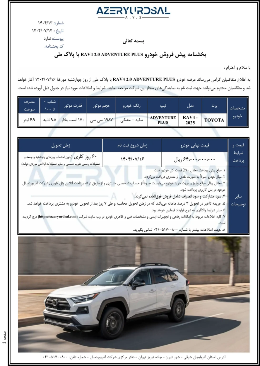 شرکت آذریوردسال شرایط فروش شاسی بلند ژاپنی خود را ویژه مهر ماه ۱۴۰۴ با پلاک ملی اعلام کرد. در شرایط فروش شرکت آذریورسال شاسی بلند تویوتا راو ۴ ادونچر پلاس با پلاک ملی ویژه متقاضیان عادی عرضه می شود. تویوتا راو۴ ها موجود خودروهایی هستند که با مشارک جانباران و در سامانه جانبازان عرqه شده اند. متقاضیان تویوتا راو۴ ادونچر با مدل ۲۰۲۵ می توانند از روز ۱۶ مهر تا زمان تکمیل ظرفیت با مراجعه با نمایندگی های این شرکت اقدام به ثبت نام این خودرو بکنند. زمان تحویل درنظر گرفته شده برای این خودرو ۶۰ روزکاری است و مشتری باید ۷۰ درصد قیمت این خودرو را پرداخت نماید.