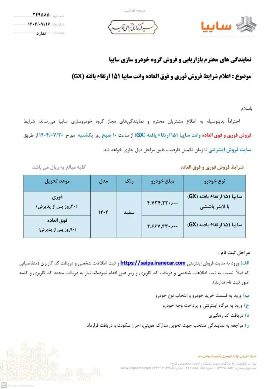 شرکت سایپا شرایط فروش دو تیپ از وانت کاروتجاری خود را ویژه مهر ماه ۱۴۰۴ اعلام کرد. در این شرایط فروش سایپا پراید وانت ۱۵۱ (GX) لاینردار ارتقاء یافته و سایپا ۱۵۱ (GX) ارتقاء یافته عرضه می شود. عرضه پراید وانت ۱۵۱ ارتقاء یافته لانیر دار به صورت فوری بوده و خودرو پس از ۳۰ روز پس از پذیرش به مشتری تحویل داده خواهد شد اما پراید وانت ارتقاء یافته بدونه لاینر به صورت ۹۰ روزه عرضه می شود. قیمت اعلامی برای پراید وانت ۱۵۱ (GX) لاینردار ۴۷۳,۴۲۳,۰۰۰ تومان بوده و نسخه بدون لاینر این وانت ۴۶۶,۷۴۳,۰۰۰ تومان است. متقاضیان این طرح فروش می توانند از ساعت ۱۰ روز یک شنبه مورخ ۲۰ مهر تا زمان تکمیل ظرفیت در طرح فروش های این وانت شرکت نمایند.