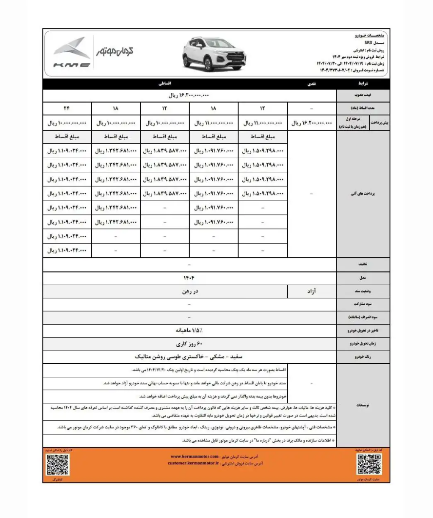 شرکت کرمان موتور شرایط فروش نقد و اقساط کراس اوور کوچک جدید خود را ویژه مهر ماه سال ۱۴۰۴ با قیمت قطعی اعلام کرد. در این شرایط فروش کراس اوور جدید کوچک کی ام سی SR3 با پرداخت نقد و اقساط با تحویل فوری ۶۰ روزکاری عرضه می شود. در روش پرداخت اقساطی متقاضیان می توانند بازه های زمانی پرداخت ۱۲، ۱۸و ۲۴ ماه را با پیش پرداخت های مختلف انتخاب نمایند. سود تاخیر در نظر گرفته شده برای این خودرو به ازاء هر ماه ۱.۵ درصد محاسبه می شود. قیمت کارخانه اعلامی برای این خودرو نسبت به شهریور ماه ۵۲ میلیون تومان ۱,۶۲۰,۰۰۰,۰۰۰ تومان است.