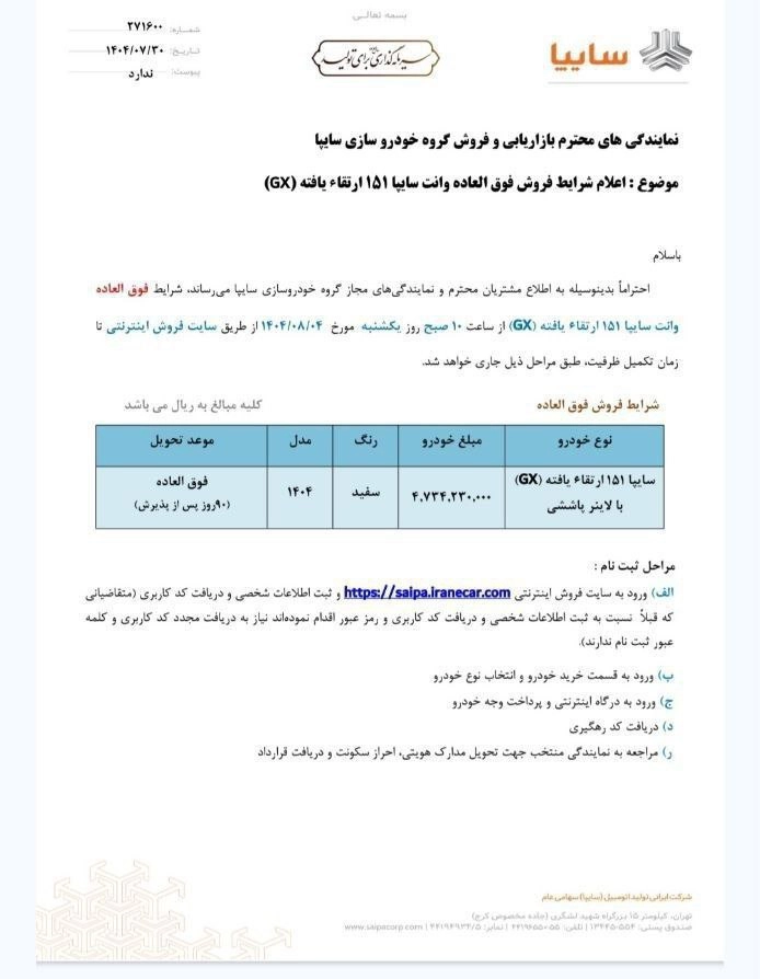 در جدیدترین شرایط فروش پراید وانت ارتقا یافته، نسخه لاینر دار این خودرو قرار است با قیمت ۴,۷۳۴,۲۳۰,۰۰۰ ریال به فروش برسد و موعد تحویل نیز ۹۰ روز کاری خواهد بود. متقاضیانی که قصد شرکت در شرایط فروش پراید وانت ارتقا یافته شرکت سایپا را دارند می توانند از ساعت ۱۰ صبح روز یکشنبه ۴ آبان ۱۴۰۴ تا زمان تکمیل ظرفیت با مراجعه به وبسایت https://saipa.iranecar.com نسبت به ثبت نام این خودرو اقدام نمایند.