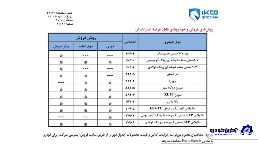 شرکت ایران خودرو در جدیدترین بخشنامه فروش خود، محصولات نظیر پژو ۲۰۷، دنا پلاس، تارا، رانا پلاس، ری را و سورن پلاس را به صورت فروش فوری، فوق العاده و پیش فروش عرضه می کند. تمامی متقاضیان این طرح که شامل طرح عادی، طرح جوانی جمعیت و طرح جایگزینی خودروهای فرسوده می باشند، می توانند در این دوره از عرضه شرکت کنند.