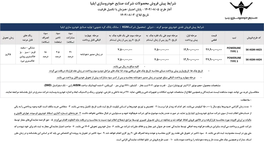 بر اساس بخشنامه فروش شرکت صنایع خودروسازی ایلیا، پیکاپ موسو گرند خان دیزلی در دو تیپ ۱ و ۳ به فروش می رسد. قیمت تیپ ۱ ۳ میلیارد و ۶۹۰ میلیون تومان در نظر گرفته شده و تیپ ۳ برچسب قیمتی ۳ میلیارد و ۷۹۰ میلیون تومانی دارد. متقاضیان خرید این پیکاپ دیزلی می بایست مبلغ کل را طی ۴ مرحله (پیش پرداخت-چک ۳۰ روزه-چک ۶۰ روزه-نقدی در زمان صدور دعوتنامه) پرداخت کنند و موعد تحویل هم پس از ۷۵ روز کاری خواهد بود. سود مشارکت و سود انصراف سالانه ۲۱ و ۱۸ درصد محسابه می شود و سود تاخیر ماهانه ۲.۵ درصد در نظر گرفته شده است. جزئیات بیشتر در مورد این شرایط فروش در جدول زیر قابل مطالعه است :