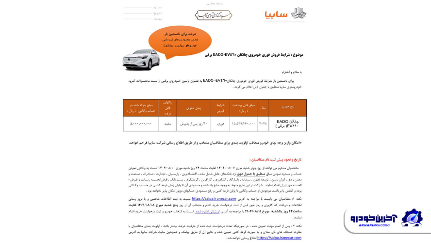 آخرین خودرو/ شرکت سایپا نخستین شرایط فروش فوری خودروی چانگان EADO-EV460 برقی را اعلام کرد.