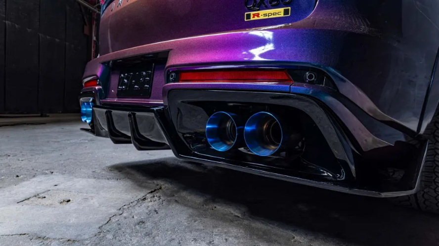ظاهر QX80 R-Spec با الهام از نیسان GT-R T-Spec، با یک پوشش رنگ خاص به نام «بنفش نیمهشب» تزئین شده که بسته به زاویه نور، تغییر رنگ میدهد. اسپلیتر جلوی فیبر کربنی، دیفیوزر تهاجمی و اسپویلر بزرگتر در عقب، چهرهٔ این شاسیبلند لوکس را به یک خودروی مسابقهای تمامعیار تبدیل کردهاند. تیاگو کاسترو، معاون اینفینیتی در آمریکا، دراینباره گفت: