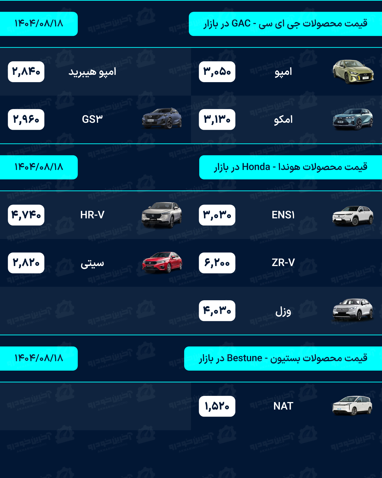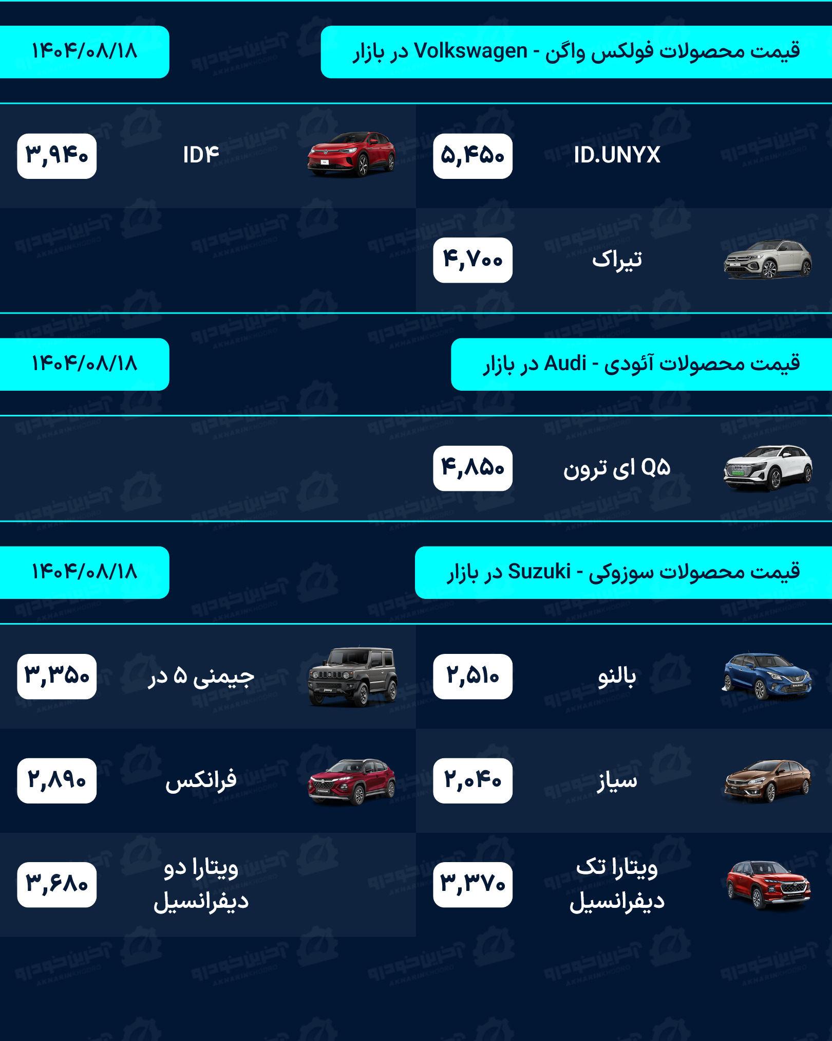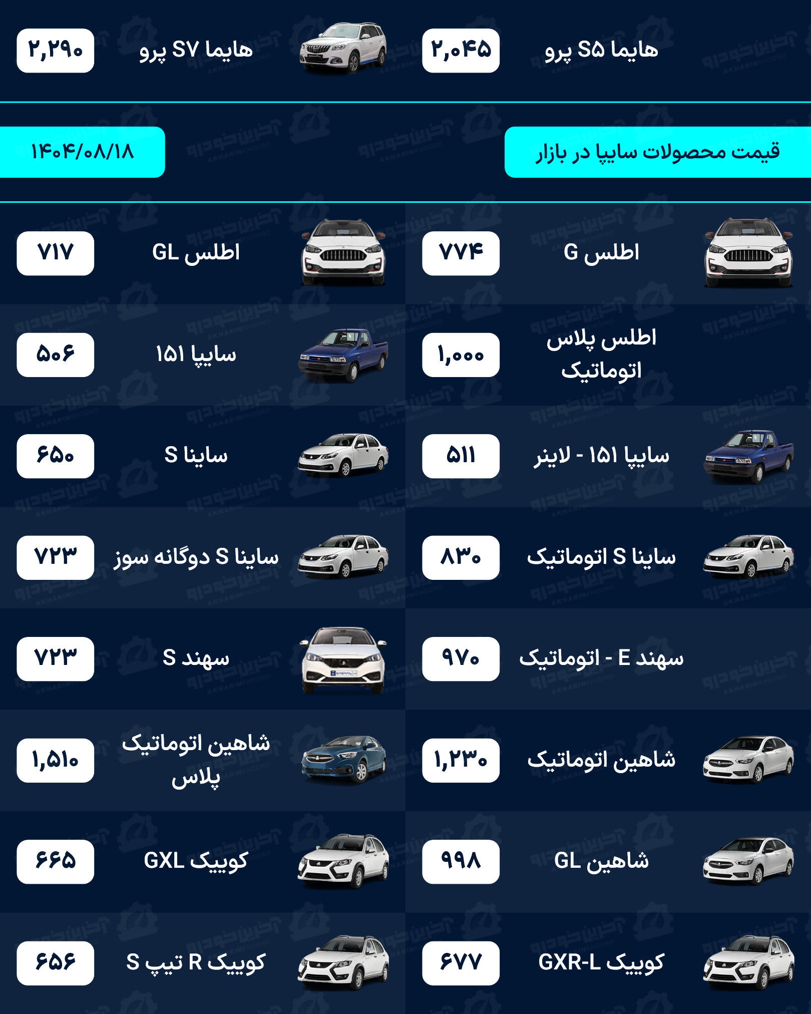 آخرین خودرو/لیستی کامل از قیمت خودروهای صفر کیلومتر داخلی، مونتاژی و وارداتی در بازار امروز مورخ 18 آبان 1404 اعلام شد.