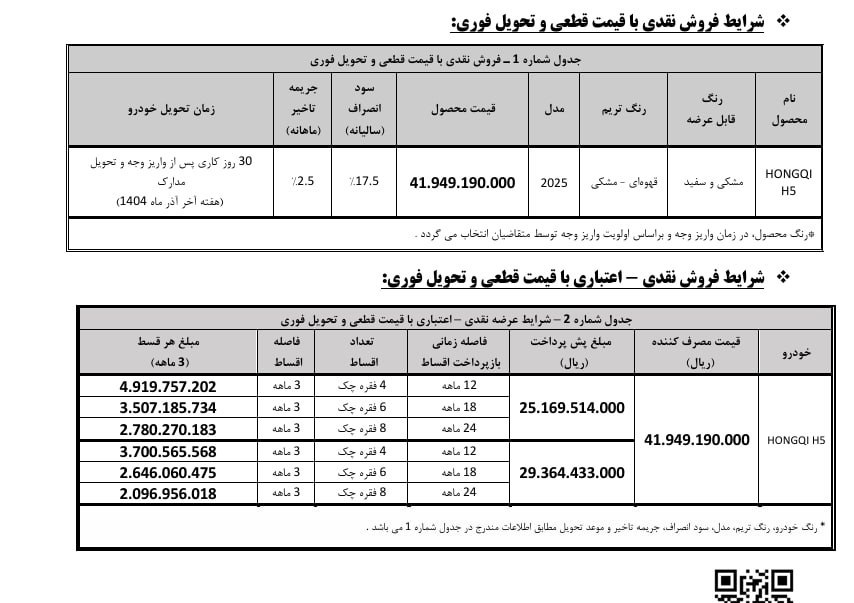 در بخش فروش نقدی، هونگچی H5 با قیمت قطعی ۴۱ میلیارد و ۹۴۹ میلیون و ۱۹۰ هزار ریال به فروش میرسد.