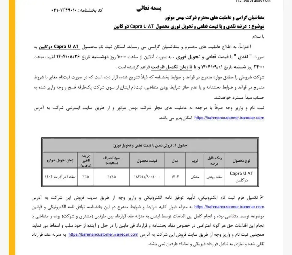 شرکت بهمن موتور شرایط فروش ارزان ترین پیکاپ دودیفرانسیل و اتوماتیک بازار را ویژه آبان ماه ۱۴۰۴ اعلام کرد. در شرایط فروش بهمن موتور پیکاپ کاپرا U دوکابین اتوماتیک به صورت فروش فوری عرضه می شود. موعد تحویل اعلامی برای کاپرا U دوکابین اتوماتیک هفته آخر آذرماه بوده و سود انصراف سالیانه ۱۷.۵ درصد و جریمه تاخیر ماهیانه ۲.۵ درصدی برای این خودرو احتساب خواهد شد. قیمت اعلامی برای کاپرا U دوکابین اتوماتیک ۱,۸۲۹,۱۹۰,۰۰۰ تومان است. متقاضیان می توانند از ساعت ۱۰ روز دوشنبه ۲۶ آبان تا پایان روز شنبه ۱ آذرماه با مراجعه به سایت فروش بهمن موتور نسبت به ثبت نام اقدام نمایند.
