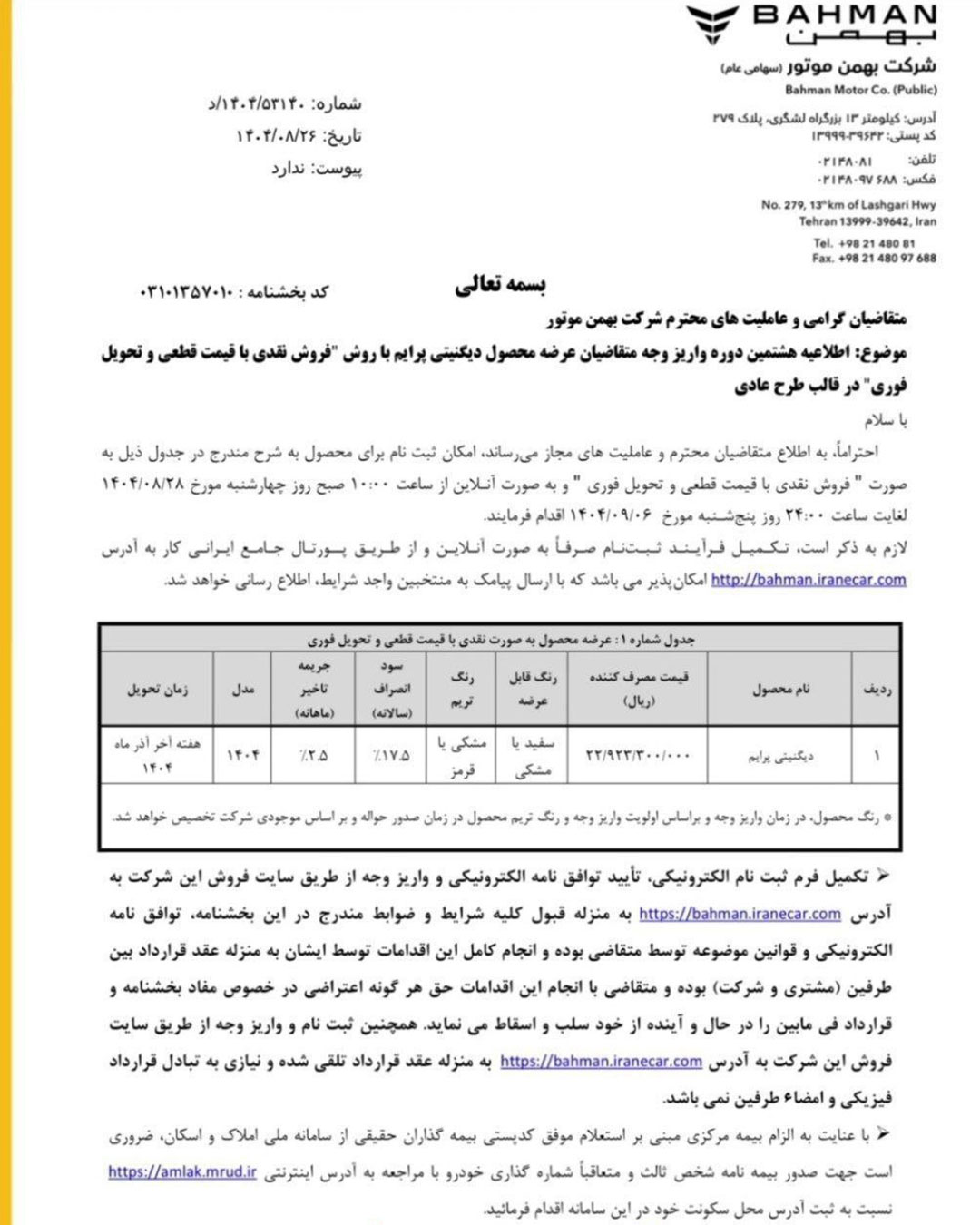 شرکت بهمن موتور شرایط فروش کراس اوور محبوب بازار خود را ویژه آبان ماه ۱۴۰۴ اعلام کرد. در شرایط فروش بهمن موتور که ویژه متقاضیان عادی است کراس اوور دیگنیتی پرایم به صورت فروش فوری عرضه می شود. موعد تحویل اعلامی برای دیگنیتی پرایم هفته آخر آذر ماه ۱۴۰۴ بوده و سود انصراف سالیانه ۱۷ درصدی و جریمه تاخیر در تحویل ۲.۵ درصد ماهیانه برای آن در نظر گرفته شده است.