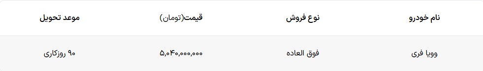 شرکت سروش موتور شرایط فروش کراس اوور جدید و جذاب خود را ویژه آبان ماه ۱۴۰۴ اعلام کرد. در شرایط فروش سروش موتور کراس اوور وویا فری ۲۰۲۵ به صورت فروش فوق العاده عرضه می شود. موعد تحویل اعلامی برای این خودرو ۹۰ روزکاری بوده و سود تاخیر ۱۸ درصد سالیانه برای آن محاسبه خواهد شد. قیمت وویا فری ۲۰۲۵ در این شرایط فروش ۵,۰۴۰,۰۰۰,۰۰۰ تومان است.
