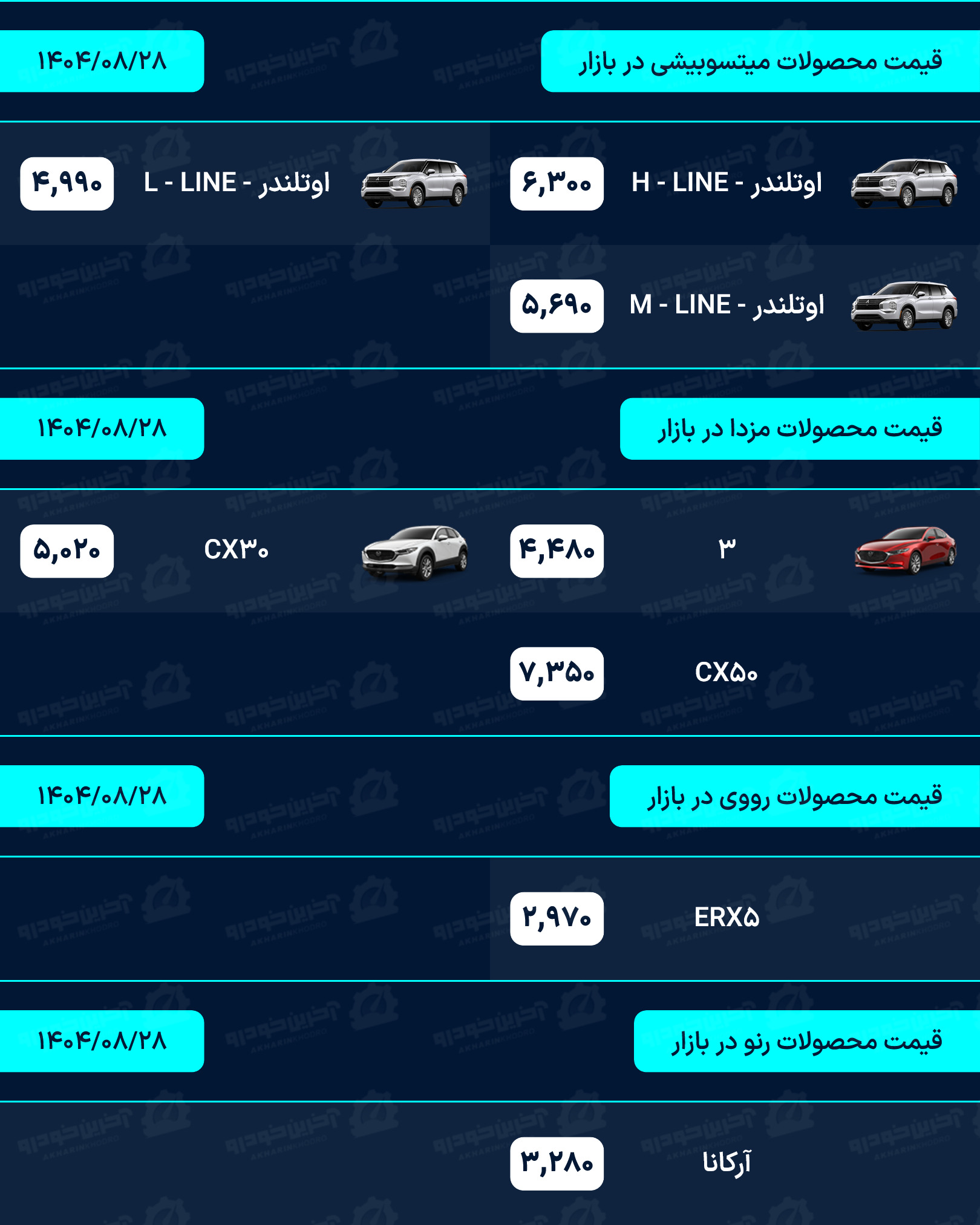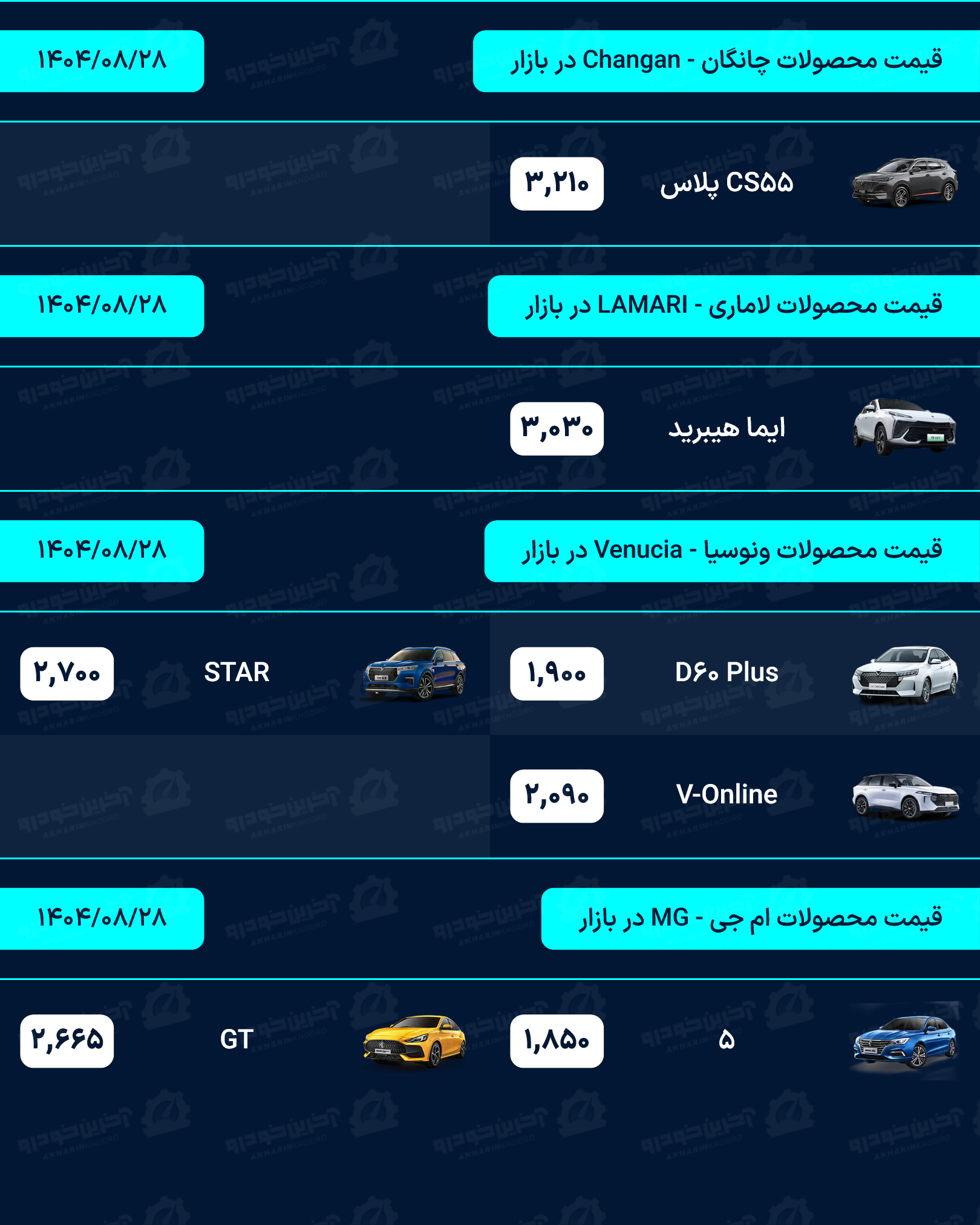 آخرین خودرو/لیستی کامل از قیمت خودروهای صفر کیلومتر داخلی، مونتاژی و وارداتی بازار امروز چهارشنبه مورخ 28 آبان 1404