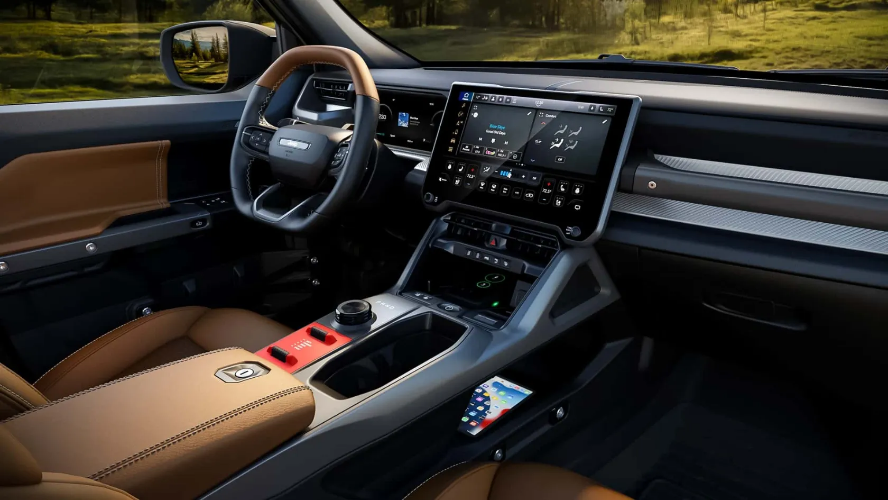 درون کابین، یک نمایشگر عریض ۲۶ اینچی که از یک صفحه آمپر ۱۲.۳ اینچی و یک نمایشگر لمسی ۱۴.۵ اینچی تشکیل شده، خودنمایی میکند. این بزرگترین نمایشگر در تاریخ محصولات جیپ است و از سیستم اطلاعات و سرگرمی Uconnect 5 پشتیبانی میکند. از دیگر ویژگیهای جالب کابین میتوان به اپلیکیشن تخصصی Trails برای نمایش اطلاعات آفرود و جابجایی بلندگوهای سیستم صوتی آلپین به زیر صندلیها اشاره کرد تا هنگام برداشتن درها، کیفیت صدا افت نکند.