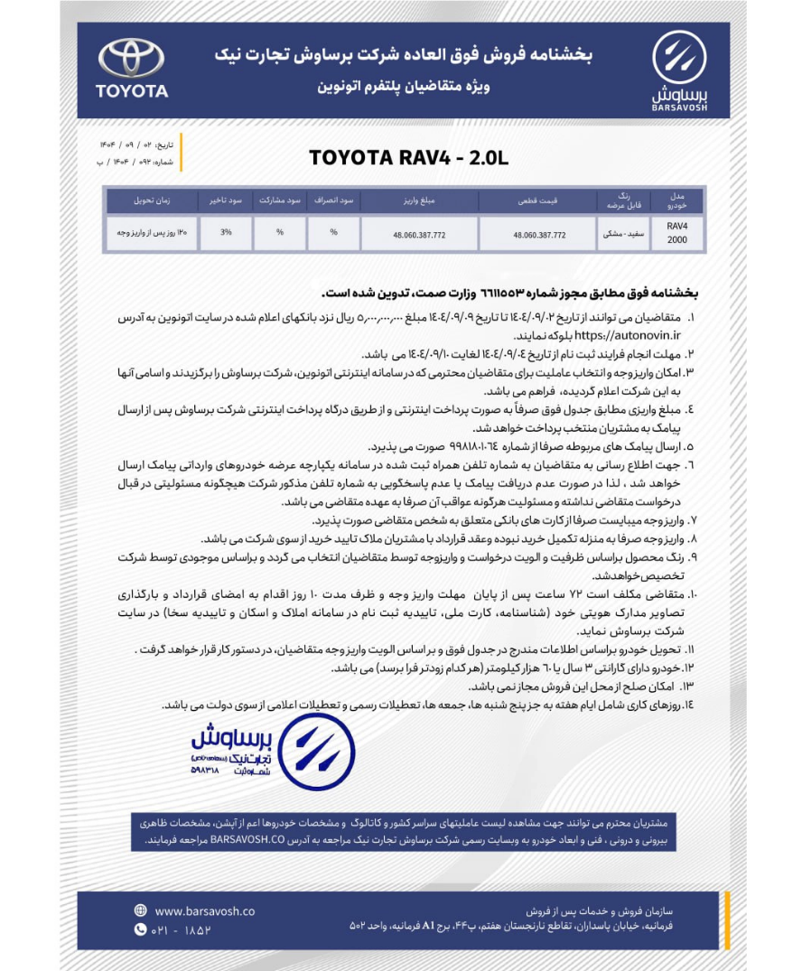 لازم به ذکر است که متقاضیانی که قصد دارند در اولین دوره از عرضه نسل جدید تویوتا راوفور شرکت کنند می بایست در مرحله اول از روز یکشنبه ۲ آذرماه ۱۴۰۴ تا روز یکشنبه ۹ آذر ۱۴۰۴ نسبت به وکالتی کردن حساب خود و بلوکه نمودن ۵۰۰ میلیون تومان اقدام نمایند و در مرحله بعدی از روز سه شنبه ۴ آذر ۱۴۰۴ تا روز دوشنبه ۱۰ آذر ۱۴۰۴ می توانند با مراجعه به سامانه اتونوین به نشانی https://autonovin.ir/ نسبت به ثبت نام و در اولین عرضه عمومی تویوتا RAV4 وارداتی شرکت کنند.