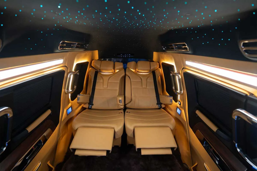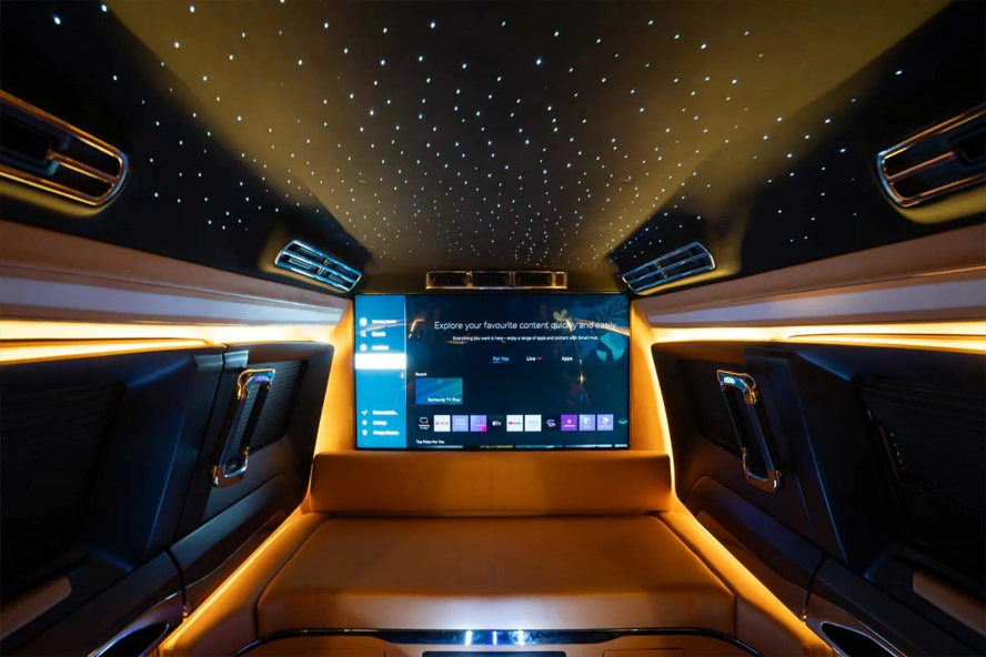 با باز شدن درها، دنیایی از تجمل آشکار میشود. کابین این لندکروزر بیشتر به یک سالن استراحت یا سینمای خصوصی شباهت دارد. فضای داخلی با چرم قهوهای روشن، تریم چوب و تزئینات کرومی پوشانده شده است. دو صندلی راحتی عظیم با زیرپاییهای بازشونده در عقب کابین قرار گرفتهاند و روبروی آنها یک کاناپه پهن قرار دارد؛ اما نقطهٔ اوج این طراحی، سقف کهکشانی با الهام از رولزرویس و یک تلویزیون غولپیکر است که فضای بین راننده و سرنشینان را کاملاً جدا میکند. پردههای برقی، نورپردازی و کفپوش ضخیم، حسی از آرامش و تجمل را به سرنشینان هدیه میدهند.