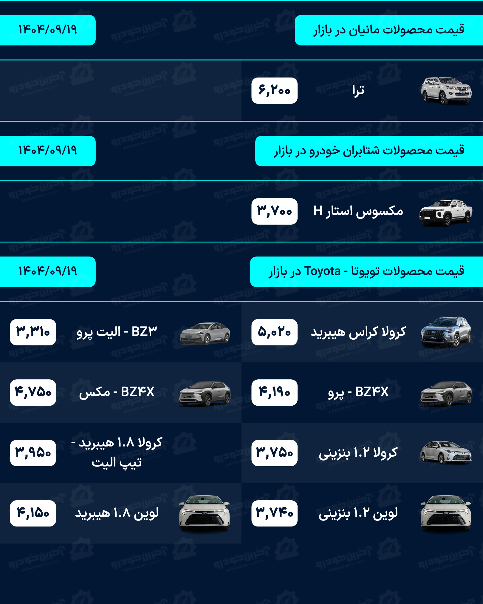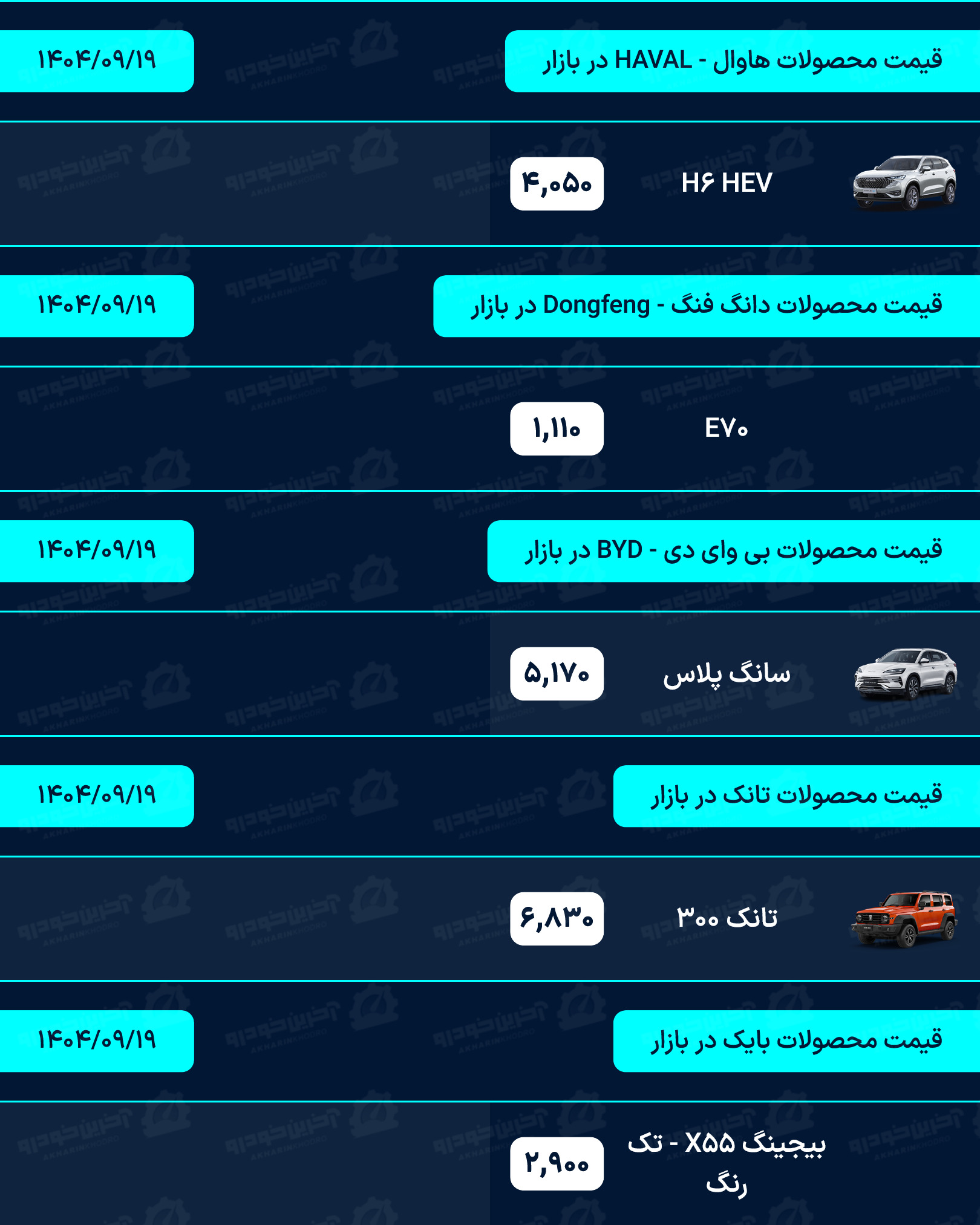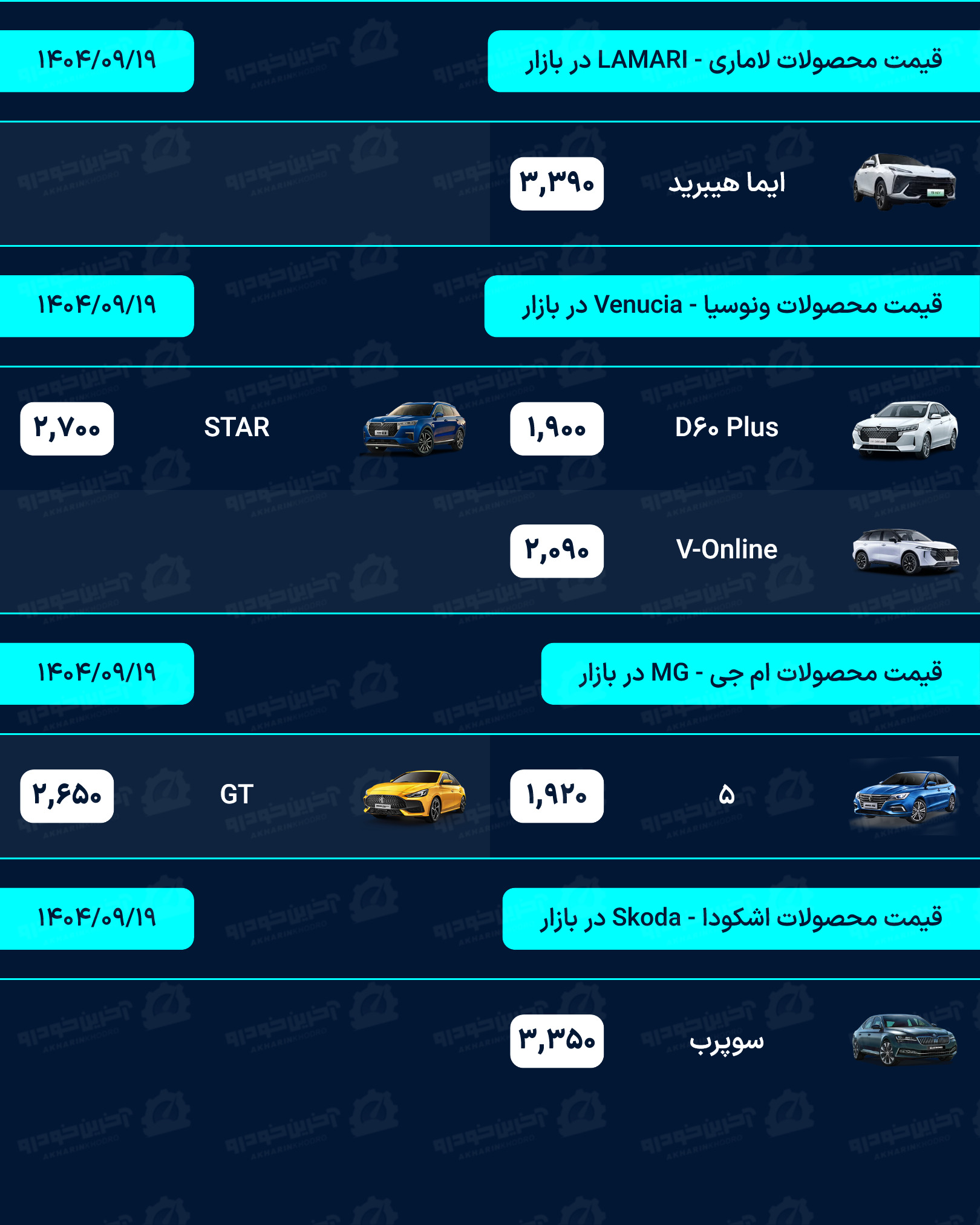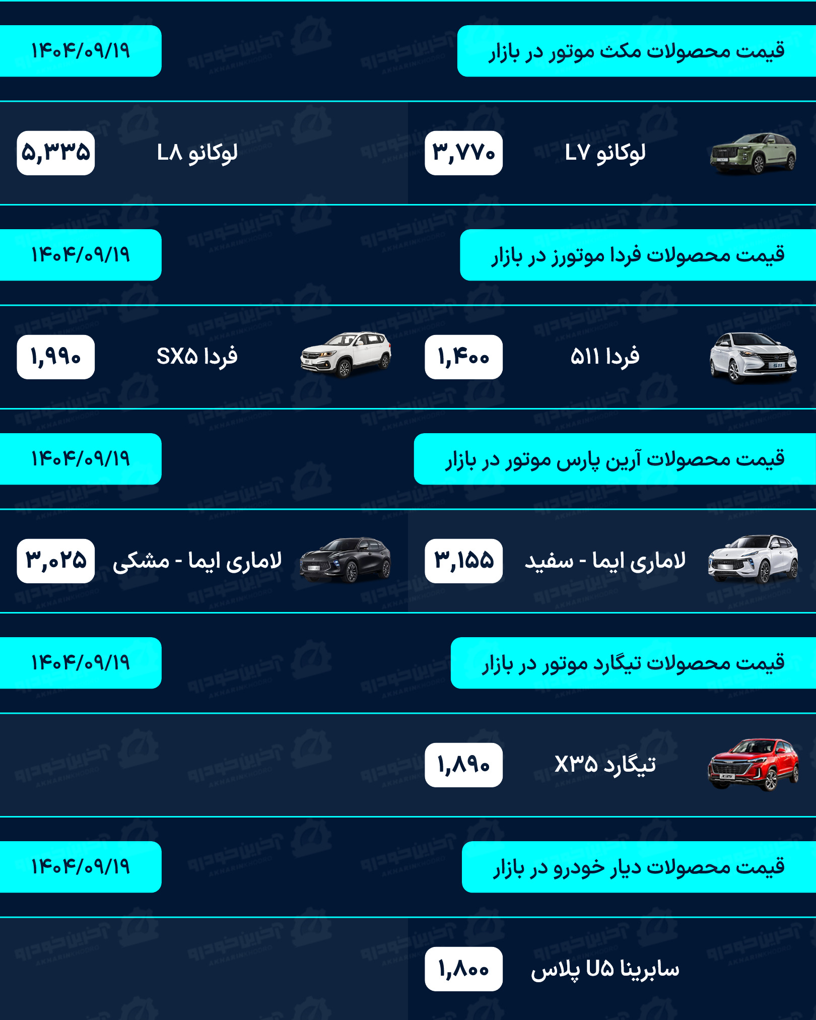 لیست قیمت خودرو روزانه در وب سایت آخرین خودرو به روز رسانی می شود. شما عزیزان می توانید برای دریافت قیمت روز تمامی محصولات داخلی، مونتاژی و وارداتی به بخش قیمت خودرو در سایت آخرین خودرو مراجعه نماید.