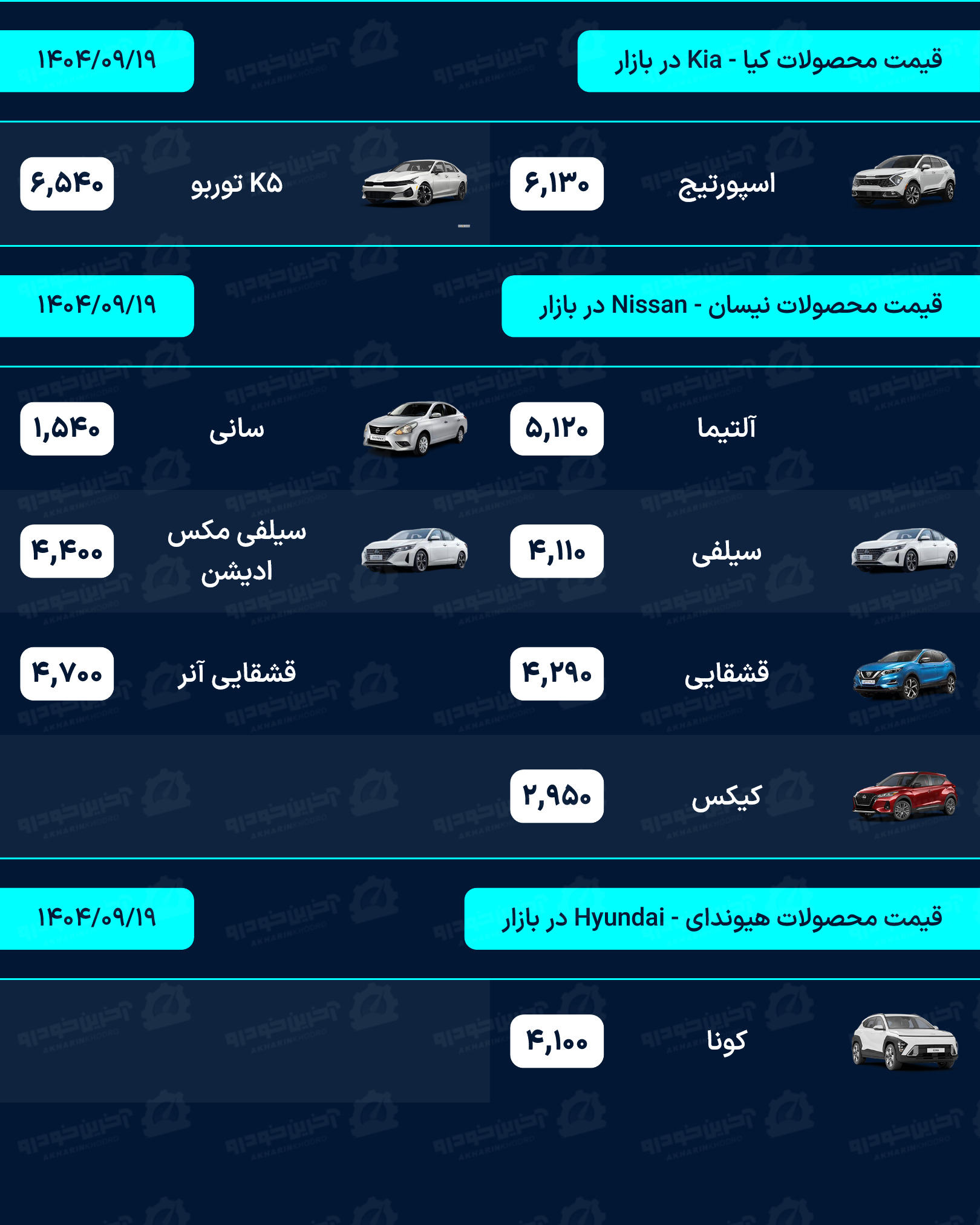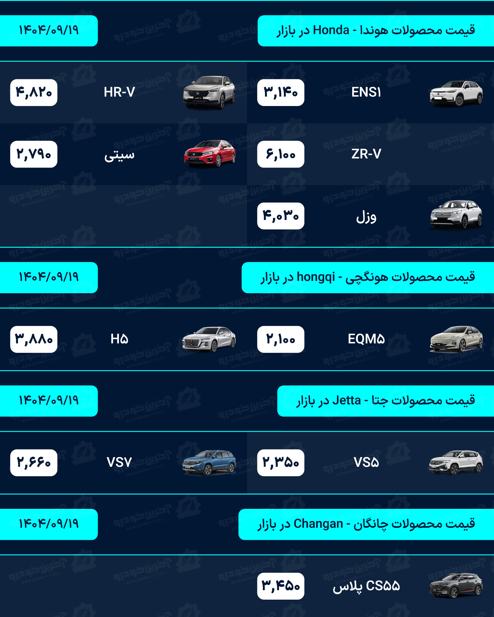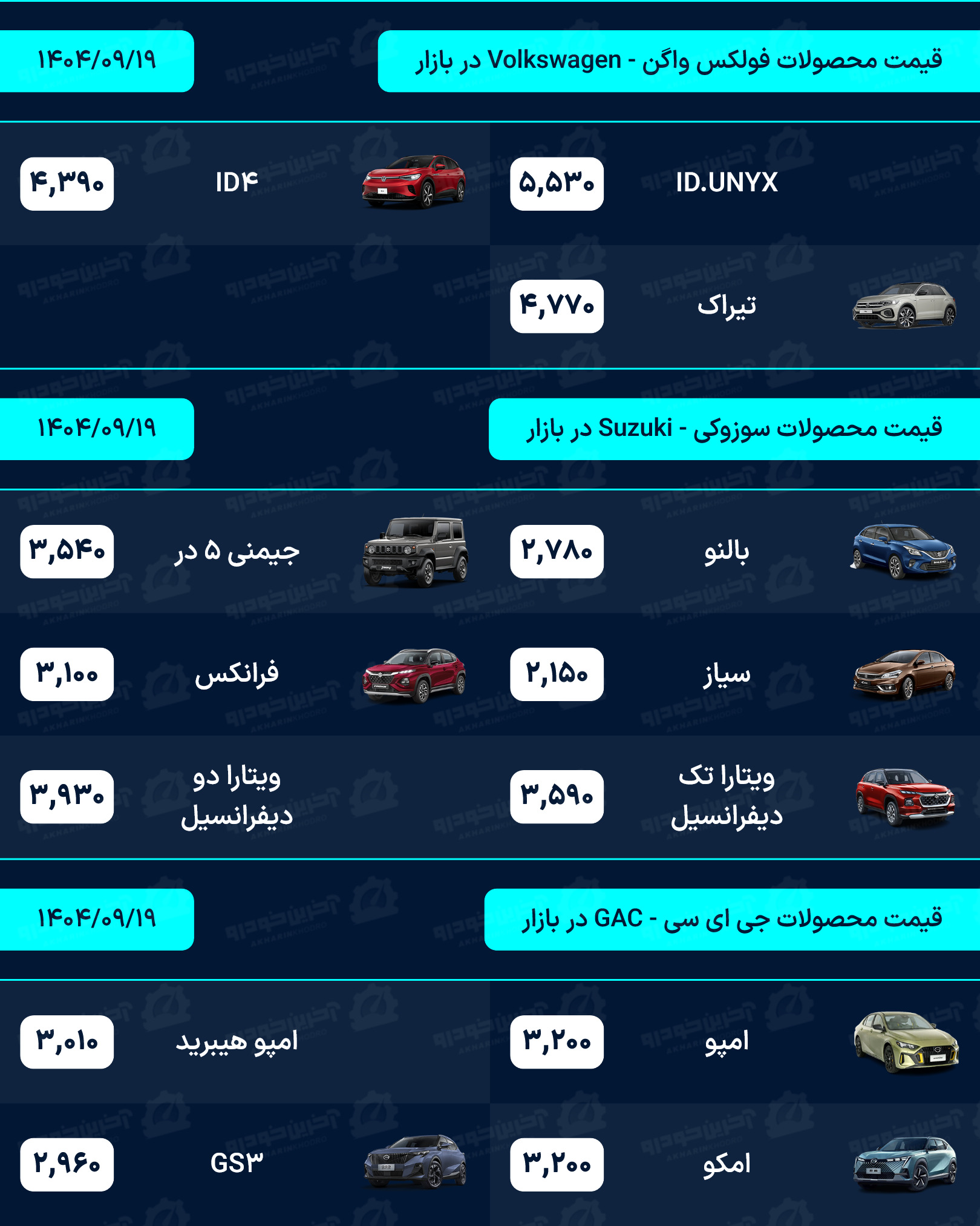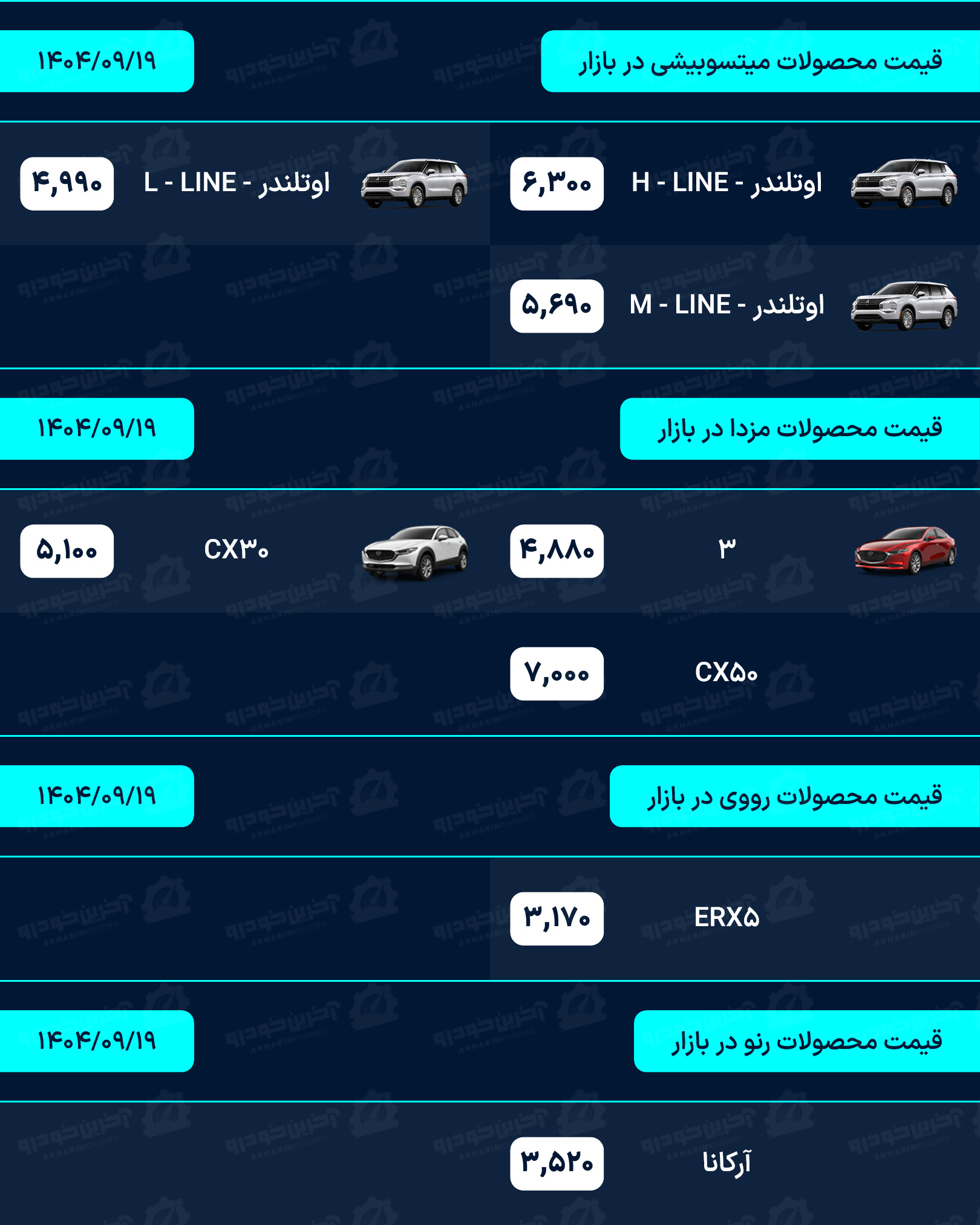 لیست قیمت خودرو روزانه در وب سایت آخرین خودرو به روز رسانی می شود. شما عزیزان می توانید برای دریافت قیمت روز تمامی محصولات داخلی، مونتاژی و وارداتی به بخش قیمت خودرو در سایت آخرین خودرو مراجعه نماید.