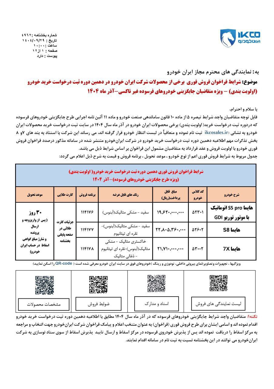 برندگان خودروهای فرسوده قرعه کش دهمین دوره ایران خودرو مهلت دارند از روز شنبه ۲۹ آذر ماه تا پایان روز دوشنبه ۸ دی ماه ۱۴۰۴ نسبت به تکمیل ثبت نام اقدام نمایند.