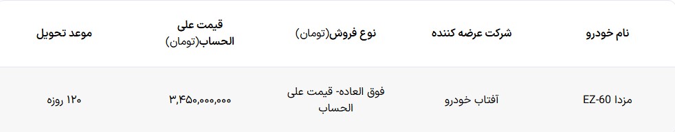 به گزارش آخرین خودرو؛ شرکت آفتاب خودرو شرایط فروش کراس اوور مدرن خود را ویژه دی ماه ۱۴۰۴ اعلام کرد. در شرایط فروش آفتاب خودرو مزدا EZ-60 به صورت فروش فوق العاده ویژه منتخبان سامانه اتونوین عرضه می شود. در این شرایط فروش قیمت علی الحساب بوده و در مرحله اول پرداخت مبلغ ۳,۴۵۰,۰۰۰,۰۰۰ تومان در نظر گرفته شده است. موعد تحویلی در نظر گرفته شده برای این خودرو ۱۲۰ روزه می باشد.
