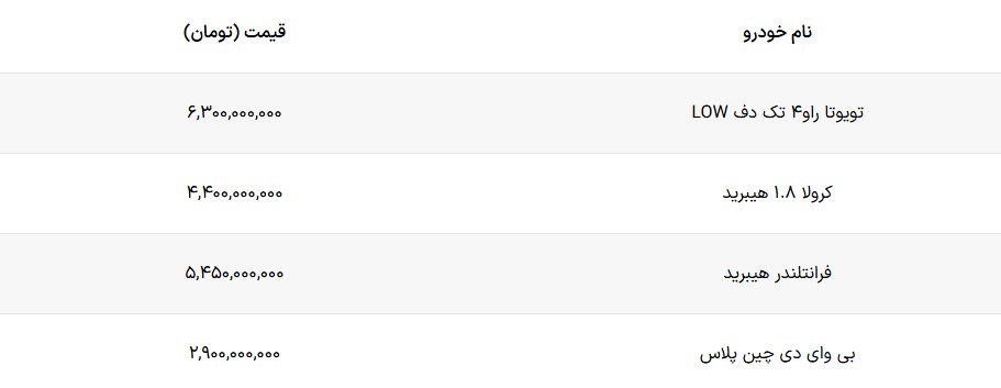 بر اساس اعلام رسمی شرکت نگین تندیس الماس، این مجموعه چهار محصول وارداتی خود را در سامانه عرضه اتونوین عرضه می کند. خودروهای تویوتا راو۴ تک دیفرانسیل، تویوتا کرولا ۱.۸ لیتر هیبرید، فرانتلندر هیبرید و بی وای دی چین پلاس خودروهایی هستند که این شرکت به سامانه اتونوین آورده است. متقاضیان می توانند از امروز نسبت به ایجاد حساب وکالتی اقدام نمایند. قیمت خودروهای وارداتی نگین تندیس الماس در این دور عرضه به شرح زیر است :