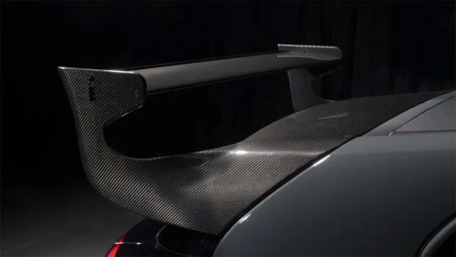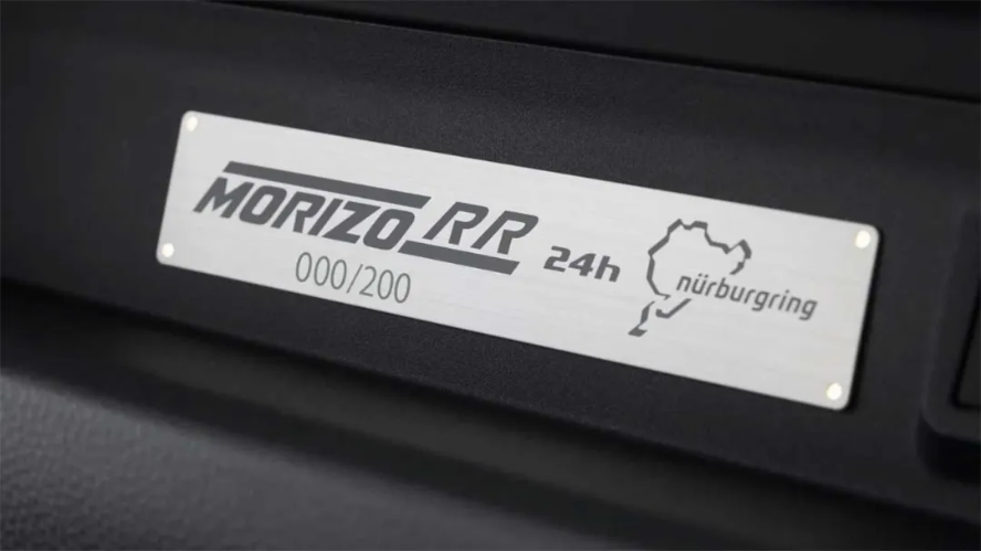 در نگاه اول، محال است متوجه باله عقب عظیم فیبر کربنی نشوید. این قطعه مستقیماً از خودروی مسابقهای تیم TGRR در نوربرگرینگ الگوبرداری شده است. علاوه بر این، اسپویلر جلو جدید، رکابهای جانبی و کاپوت فیبر کربنی، چهرهای تهاجمیتر به این ژاپنی کوچک بخشیدهاند. رنگ بدنه خاص خاکی گراول تنها مختص این نسخه است که با جلوپنجره مشکی پیانویی و رینگهای برنزی مات تضاد زیبایی ایجاد میکند. پشت این رینگها، کالیپرهای ترمز زرد روشن خودنمایی میکنند؛ رنگی که امضای شخصی موریزو محسوب میشود.