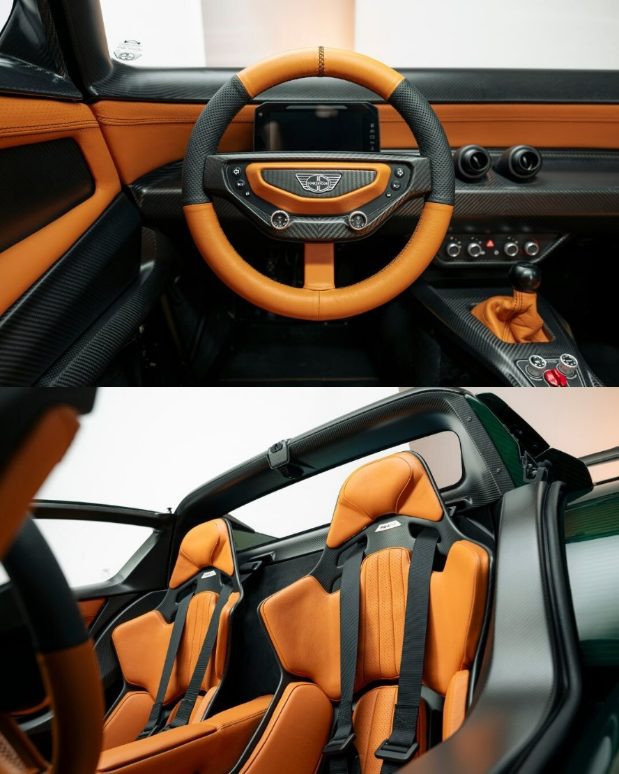 تقریبا هر چیزی که می بینید از فیبر کربن ساخته شده؛ هم برای کاهش وزن و هم افزایش استحکام. علاوه بر آن، مقدار قابل توجهی فلز چاپ سه بعدی شده هم در خودرو وجود دارد؛ مثلا سر اگزوزها.