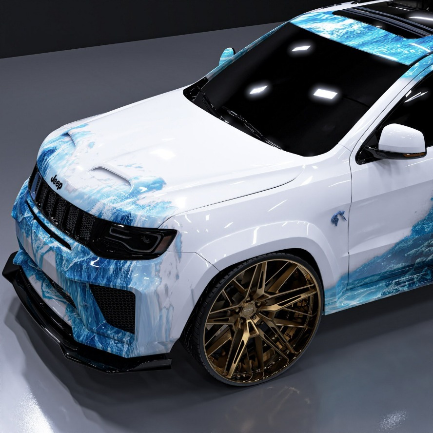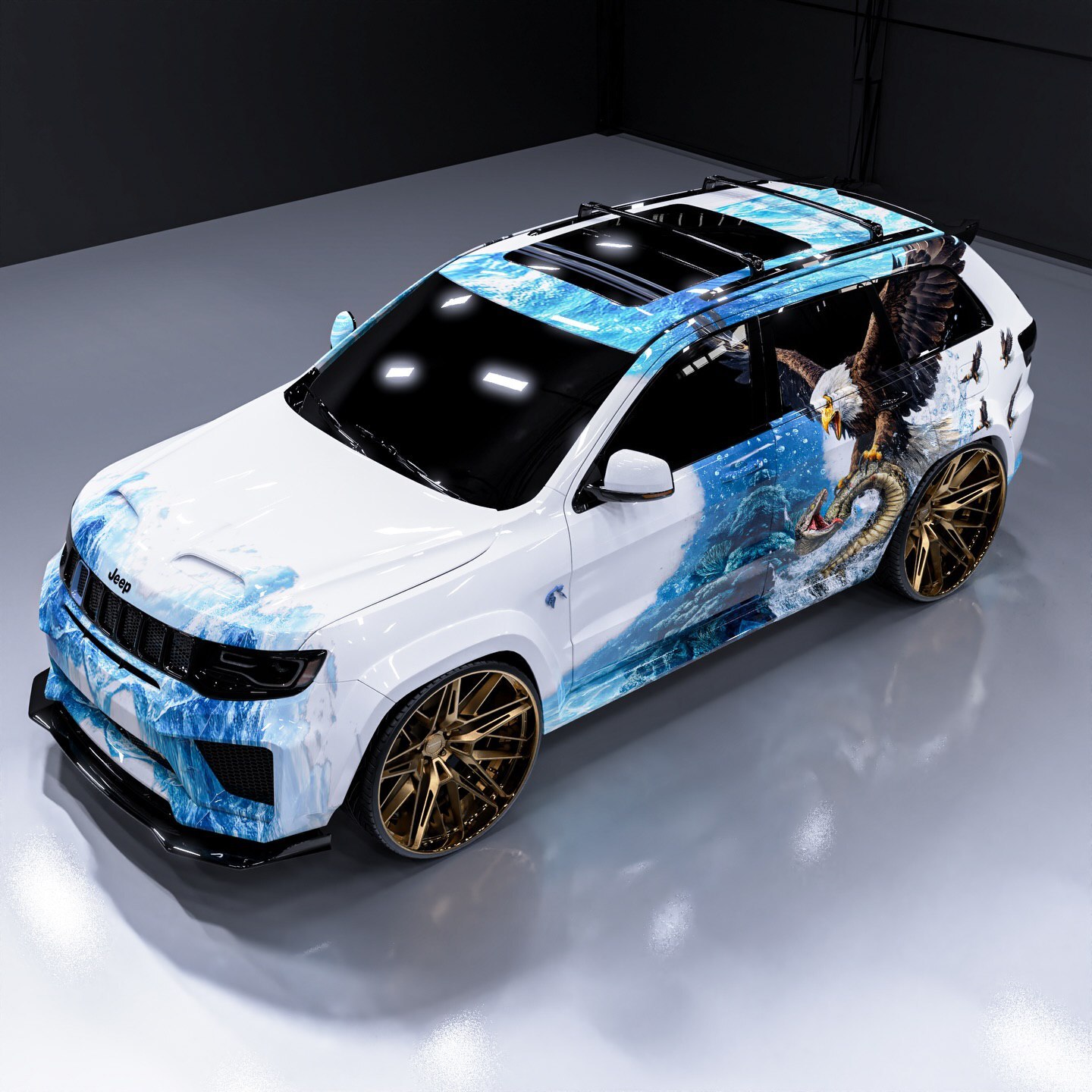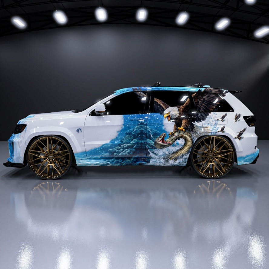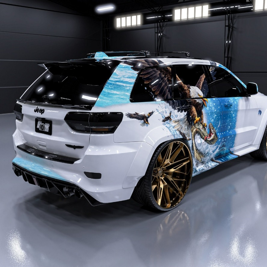 این خودرو به یک پوشش کامل (Wrap) با چاپ گرافیکی رنگی مجهز شده است. طرح اصلی این کاور، تصویر اختصاصی از شاهینهایی است که در حال پرواز، ماری را از آب شکار میکنند. این طراحی که با دقت و ظرافت بالا بر روی بدنه اجرا شده، جلوهای متفاوت به این شاسیبلند قدرتمند بخشیده است.