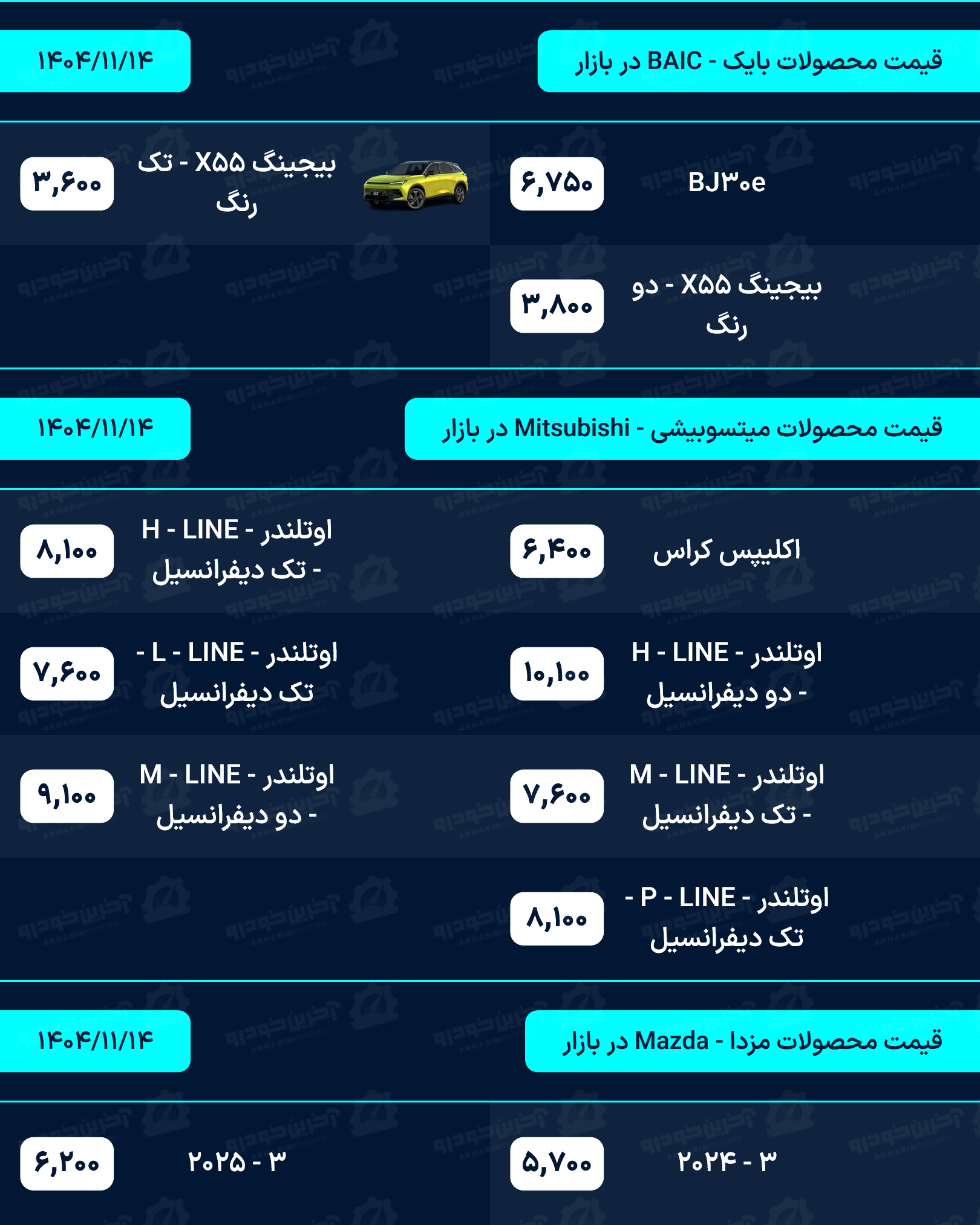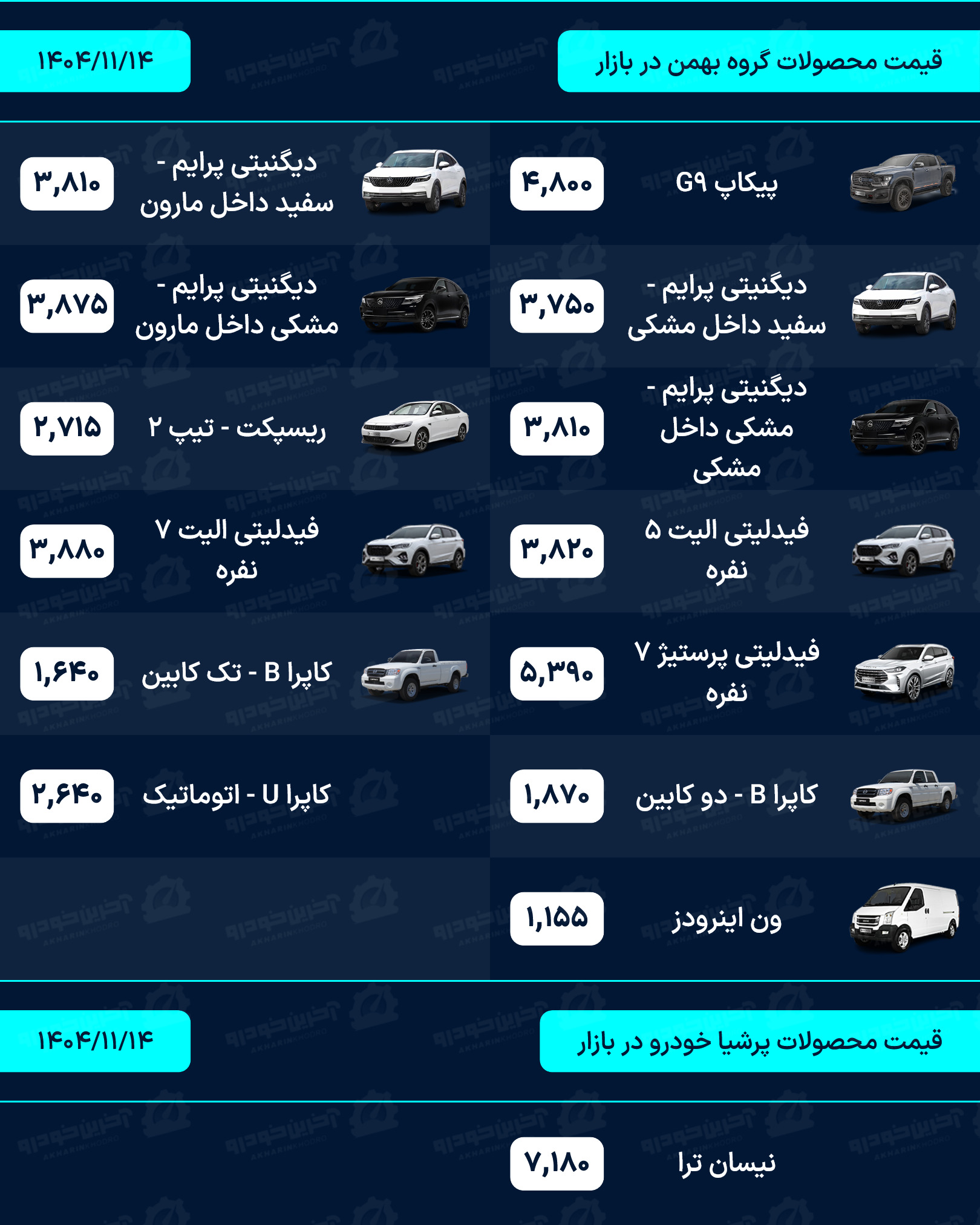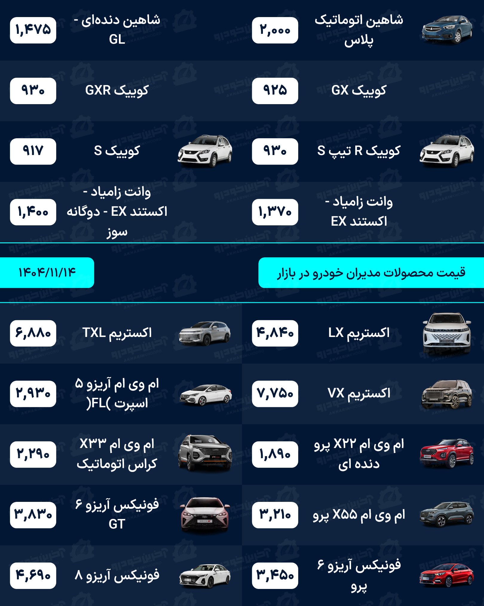 آخرین خودرو/لیستی کامل از قیمت خودروهای صفر کیلومتر داخلی، مونتاژی و وارداتی بازار امروز سه شنبه مورخ 14 بهمن 1404