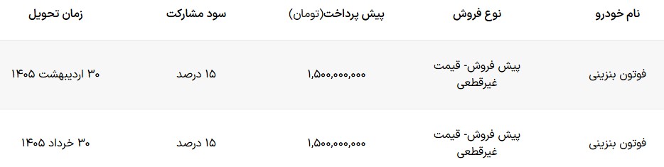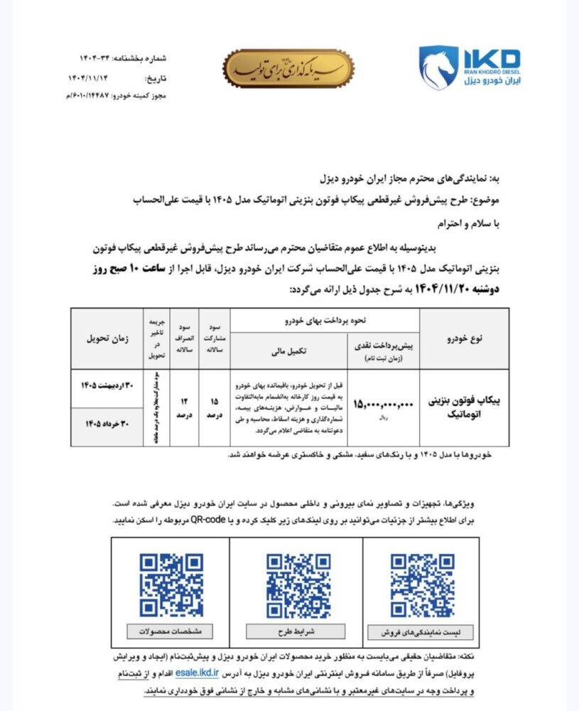 به گزارش آخرین خودرو؛ شرکت ایران خودرو دیزل شرایط فروش پیکاپ خود را ویژه بهمن ماه ۱۴۰۵ اعلام کرد. در شرایط فروش ایران خودرو دیزل فوتون جی ۷ بنزینی به صورت پیش فروش عرضه می شود. موعد تحویل فوتون بنزینی در این بخشنامه فروش ۳۰ اردیبهشت و خرداد ۱۴۰۵ است. قیمت در این شرایط فروش به صورت علی الحساب بوده و مشتری باید در هنگام ثبت نام مبلغ ۱,۵۰۰,۰۰۰,۰۰۰ تومان پرداخت کند. سود تاخیر اعلامی برای این خودرو، سود مشترک به علاوه ۱ درصد سود است.