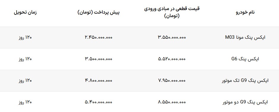 آخرین خودرو/شرکت ایکس موتورز به عنوان نماینده رسمی ایکس پنگ در ایران، قیمت و شرایط فروش چهار محصول این نشان تجاری را اعلام کرد.