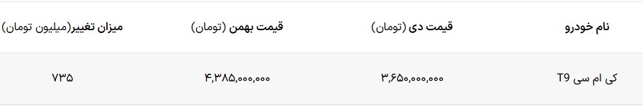 قیمت جدید کی ام سی T9 اعلام شد – بهمن ۱۴۰۴