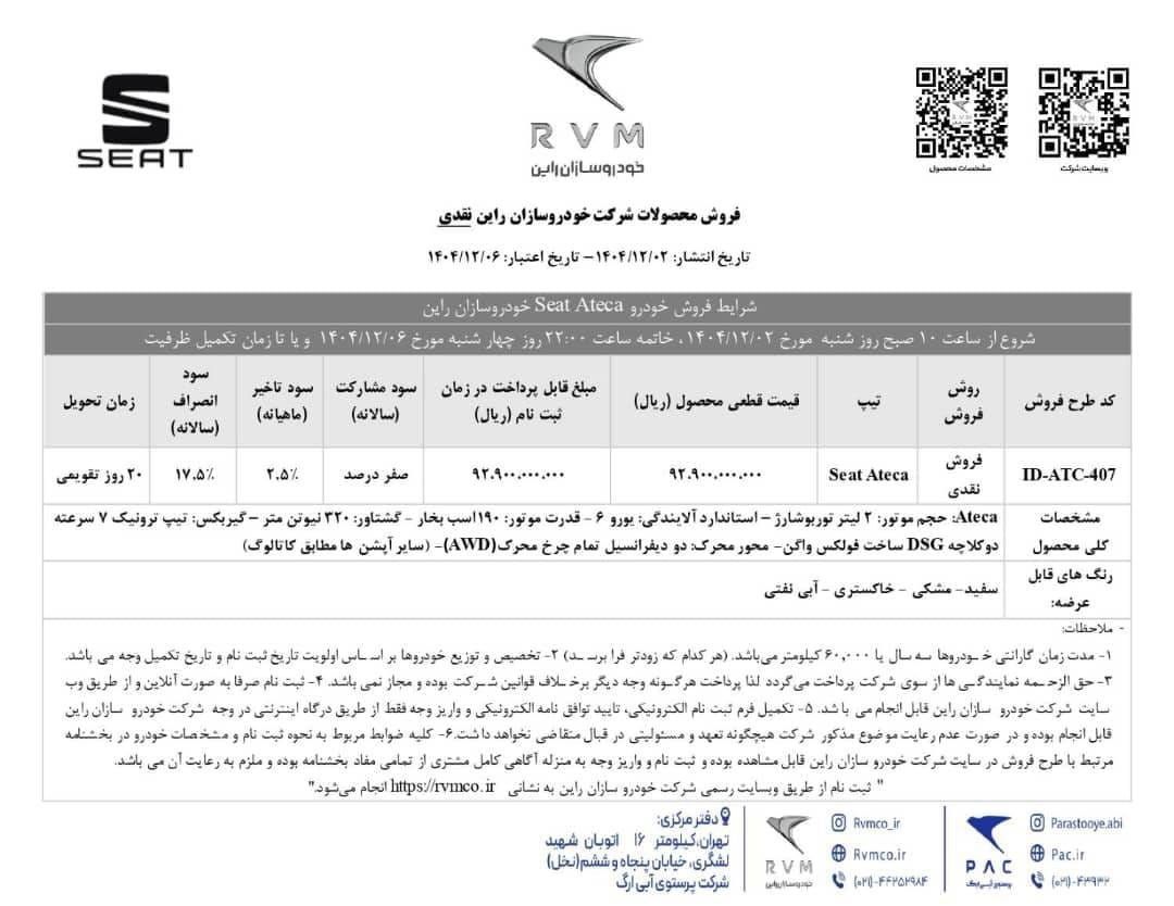 شرایط فروش و قیمت جدید سئات آتکا اعلام شد – بهمن ۱۴۰۴
