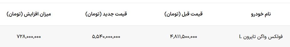 فولکس واگن تایرون L جدیدترین وارداتی شرکت ماموت خودرو است که عرضه آن به تازگی در نمایندگی های این شرکت انجام شده بود. پیشتر این خودرو با قیمت مصوب ۴ میلیارد و ۸۱۱ میلیون و ۵۰۰ هزار تومان به عرضه رسید اما حالا قیمت جدید برای این کراس اوور ۵ میلیارد و ۵۴۰ میلیون تومان اعلام شده است. بر این اساس افزایش قیمت ۷۲۸ میلیون تومانی را برای این خودرو داشته ایم و فروش های جدید بر مبنای همین قیمت محاسبه می شود.