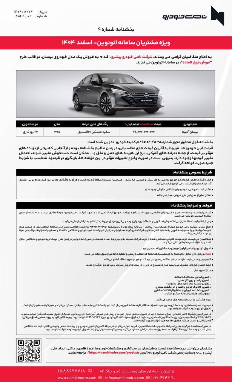 آخرین خودرو/شرکت نامی خودرو سدان و کراس اوور نیسان را در سامانه اتونوین عرضه می کند؛ نیسان قشقایی و آلتمیا عرضه اسفند ۱۴۰۴ اتونوین.