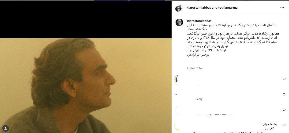 ایرنا/ صفحه اینستاگرامی عباس کیارستمی خبر از درگذشت همایون ارشادی بازیگر سینما داد.