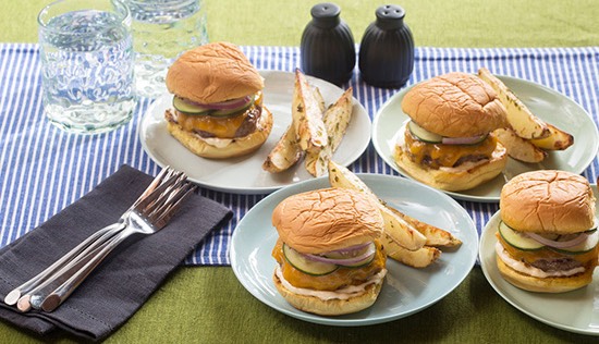 5. پخت همبرگر: در زمان پخت سیب‌زمینی‌ها، 1 قاشق غذاخوری روغن داخل تابه‌ای متوسط (ترجی‌ها نچسب) بریزید و روی حرارت نسبتاً زیاد قرار دهید تا داغ شود. همبرگر را داخل تابه بگذارید و هر طرف آن را 4 دقیقه سرخ‌کنید یا تا زمانی که خوب پخته شوند. وقتی یک‌طرف همبرگر سرخ شد، آن را زیرورو کنید و پنیر را روی قسمت پخته همبرگر بگذارید تا آب شود. سپس همبرگرها را به ظرفی دیگر منتقل کنید و درجایی گرم قرار دهید. تابه را تمیز کنید