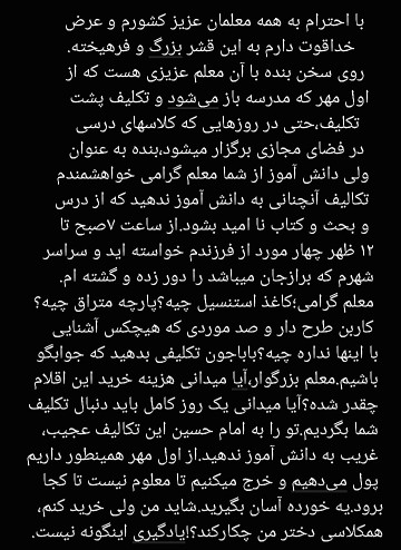 خسته شده ایم از دادن تکالیفی که به دانش آموز میدهید که باعث بشود آن نوجوان ما از درس و یادگیری ناامید بشود.درس و تکلیف اینگونه هست که یک روز کامل در فروشگاههای لوازم التحریر،خرازی و غیره بگردیم به دنبال آن چیزی که شما از فرزندمان خواسته اید.باباجون فکر هزینه این تکالیف را کرده اید چقدر میشود؟دانش آموز را خسته نکنید با درس و تکلیفی که نتواند و نمیتوانم انجام بدهم را برزبان بیاورد.(معلم گرامی،در یکی از مدارس دخترانه شهر برازجان استان بوشهر روی سخن با شماست). "مخاطبان گرامی آخرین خبر؛ برای ارسال تصاویر؛ لطفا در صفحه عکاسخونه؛ آیکون دوربین در بالای صفحه را انتخاب نموده و تصویر خود را ارسال فرمایید."