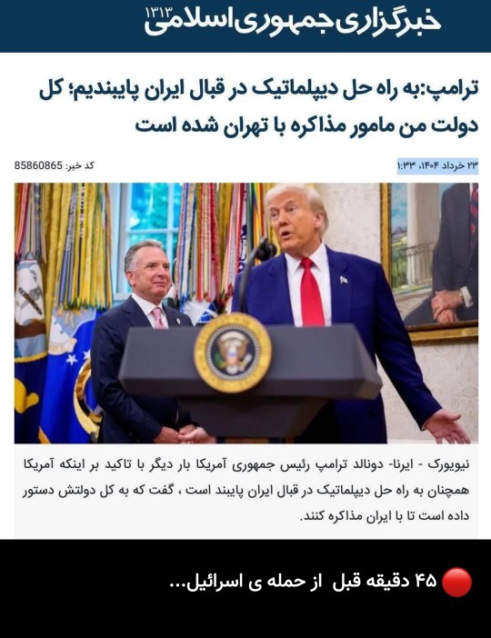 ❌نتیجه مذاکرات قبلی شد حمله به ایران. دوباره مذاکره میکنین؟ "مخاطبان گرامی آخرین خبر؛ برای ارسال تصاویر؛ لطفا در صفحه عکاسخونه؛ آیکون دوربین در بالای صفحه را انتخاب نموده و تصویر خود را ارسال فرمایید."