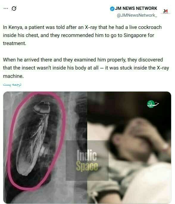 🔹وقتی به آنجا رسید و آنها او را به درستی معاینه کردند متوجه شدند که حشره اصلاً داخل بدنش نیست - داخل دستگاه اشعه ایکس گیر کرده بود.