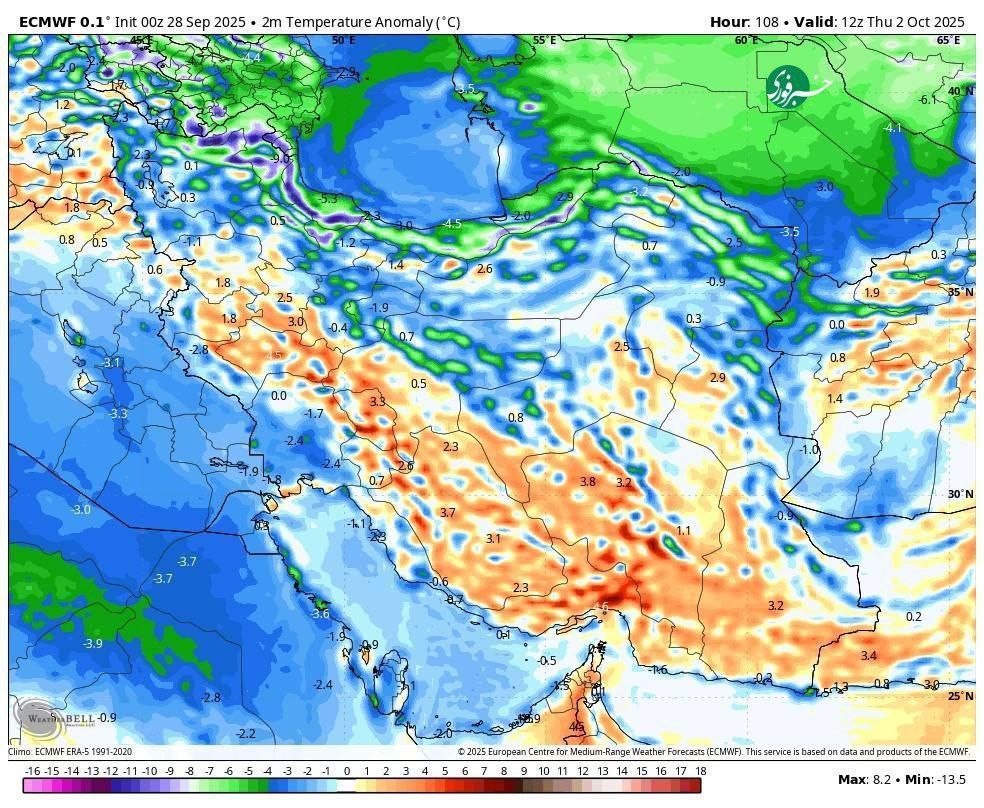 بر اساس نقشههای پیشبینی، از ۱۰ مهر دما در مشهد و بخشهای زیادی از خراسان رضوی حدود ۲ تا ۳ درجه کمتر از میانگین بلندمدت خواهد بود، این یعنی چند روز آینده هوای استان حالوهوای خنک و پاییزیتری به خود میگیرد، موج گرمایی در نقشهها دیده نمیشود.