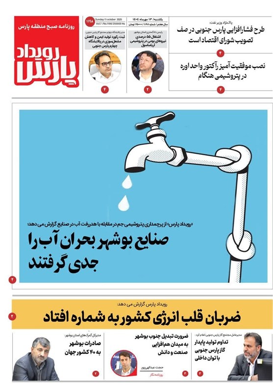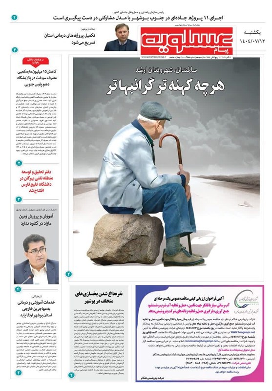 تصاویر منتخب صفحات نخست روزنامههای یکشنبه 13 مهر در استان بوشهر (رویداد پارس، بامداد جنوب و پیام عسلویه) منتشر شد. این صفحات نخست بازتابدهنده مهمترین رویدادها، اخبار و تحولات اقتصادی، گردشگری، محیطزیستی و اجتماعی هستند و نگاه رسانهها را به مسائل روز استان بوشهر ارائه میدهند.