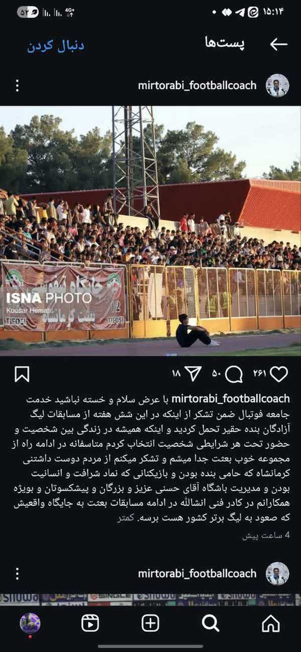 فارس/ محمد میرترابی پس از ۶ هفته هدایت تیم بعثت کرمانشاه، جدایی خود را از هدایت این تیم اعلام کرد.
