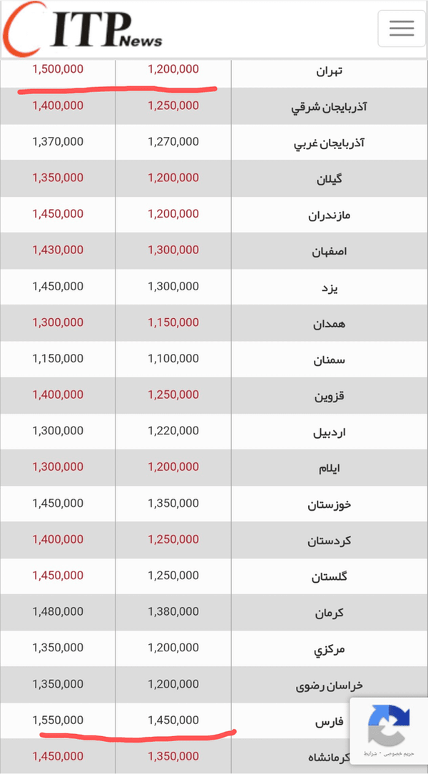 فارس/ جدول حداقل و حداکثر قیمت مرغ در بازار دیروز شیراز اعداد ۱۴۵ و ۱۵۵ هزار تومان را نشان میدهد در حالیکه این عدد در تهران ۱۲۰ و ۱۵۰ هزار تومان است، این در صورتی است که رئیس سازمان جهاد کشاورزی فارس وعده کاهش قیمت را تا پایان هفته میدهد.