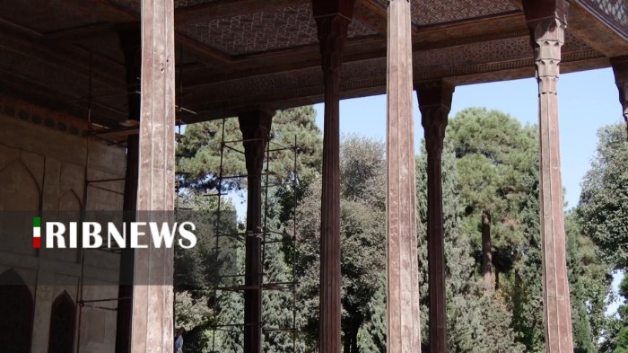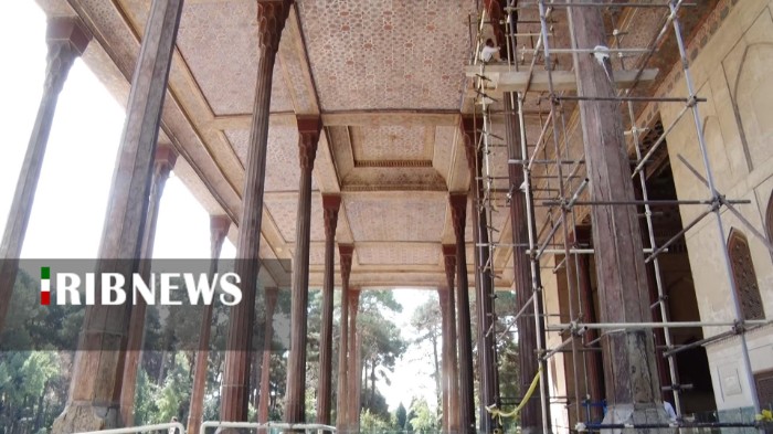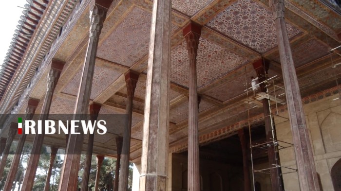 صدا و سیما/ عملیات پاک‌سازی، مرمت و غبارروبی ستون‌های ایوان کاخ چهل‌ستون در اصفهان آغاز شد.