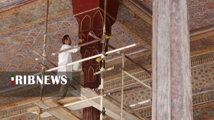 پاک‌سازی و مرمت ستون‌های ایوان کاخ چهل‌ستون اصفهان