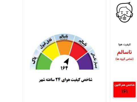 شاخص کیفی هوای مشهد در ۲۴ ساعت گذشته به عدد ۱۶۴ رسیده و در وضعیت ناسالم برای تمامی گروهها قرار گرفت. شاخص لحظهای نیز ۱۶۱ و در وضعیت قرمز و ناسالم برای تمامی گروهها است.