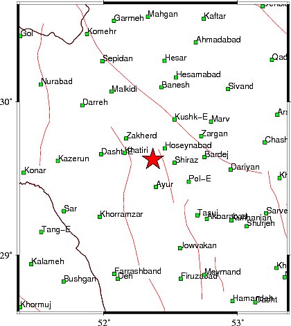 این زمینلرزه در فاصله تنها ۱۵ کیلومتری شهر شیراز، ۲۲ کیلومتری شهر خانه زنیان و ۳۸ کیلومتری شهر زرقان به وقوع پیوسته است.