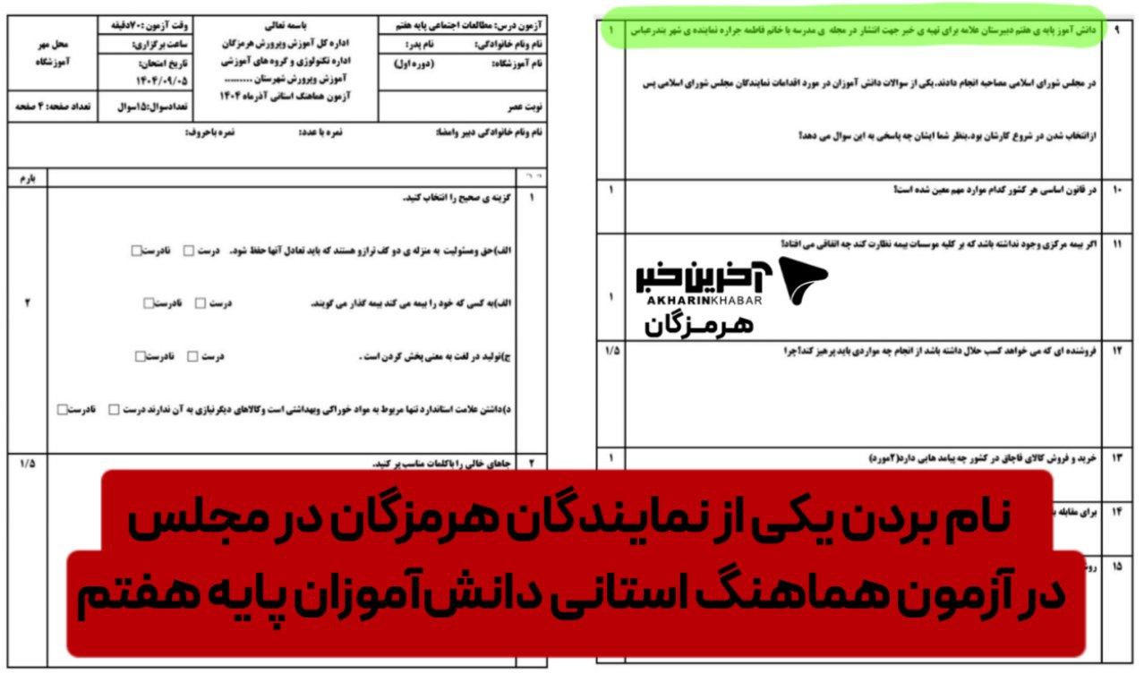 آخرین خبر/ آموزش و پرورش هرمزگان در اقدامی سوالبرانگیز، اقدام به نام بردن یکی از نمایندگان هرمزگان در مجلس در آزمون هماهنگ استانی درس مطالعات پایه هفتم نموده است.
